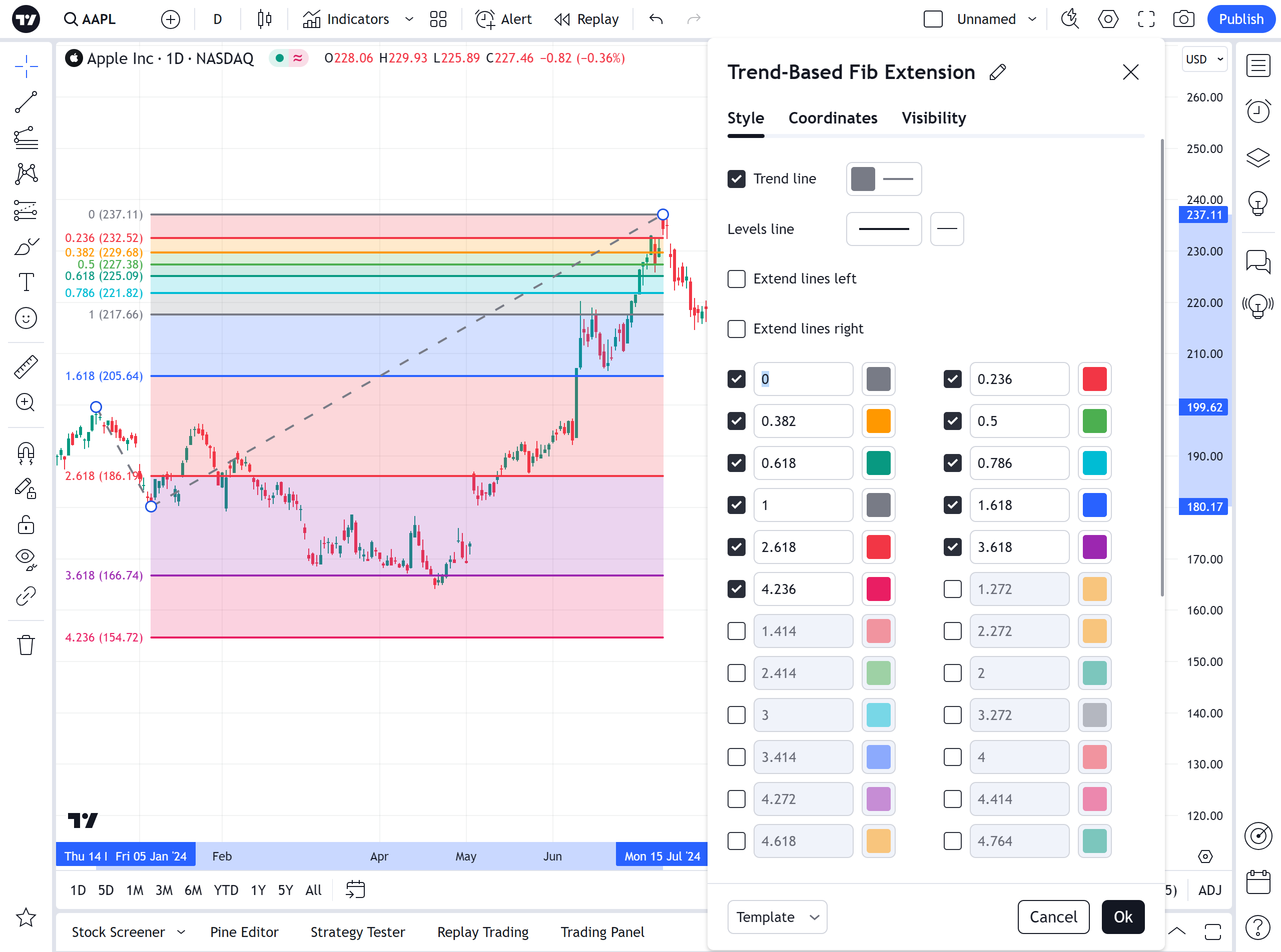 在可见性属性对话框中,您可以切换斐波那契趋势扩展在不同时间周期的图表上的可见性。