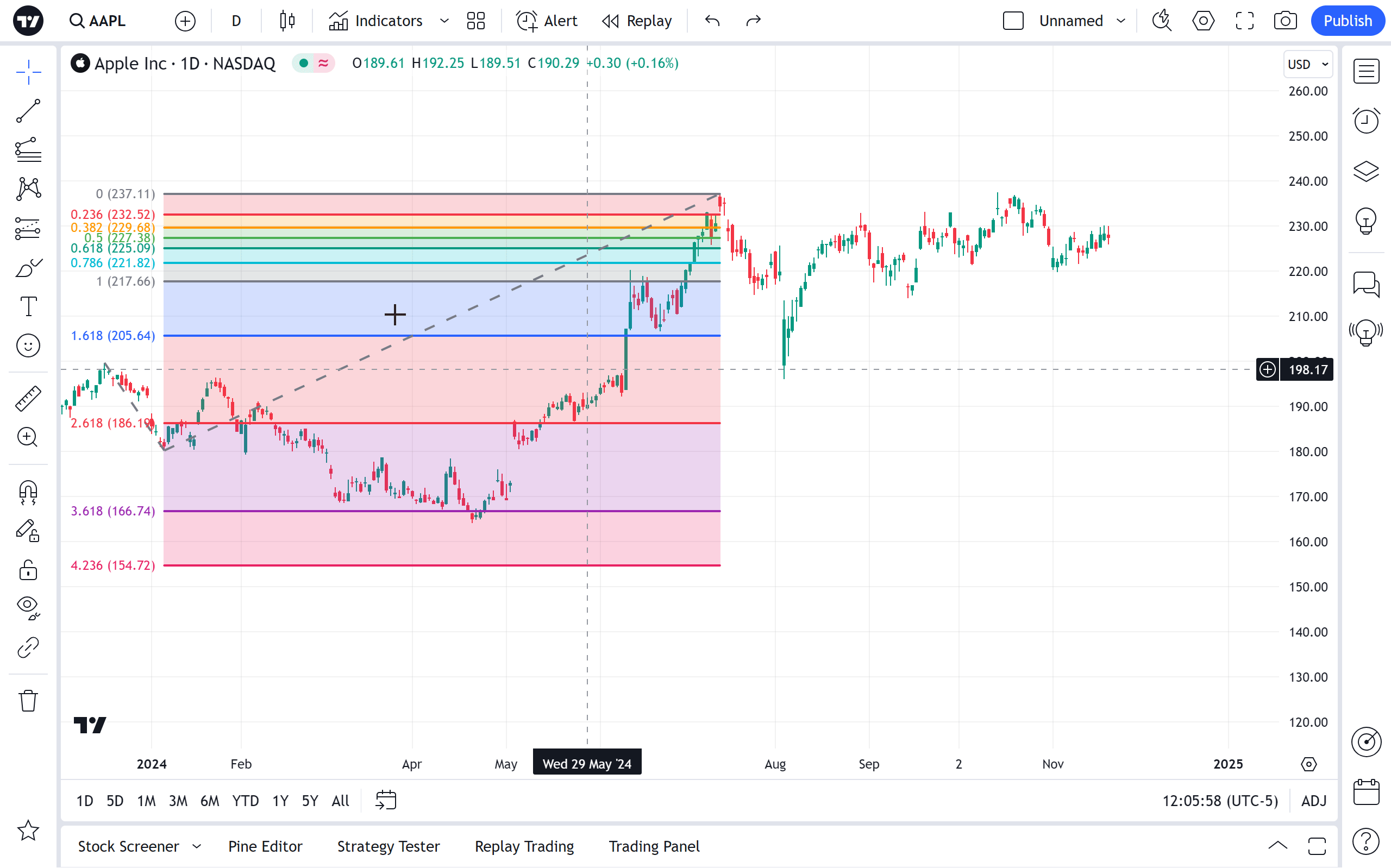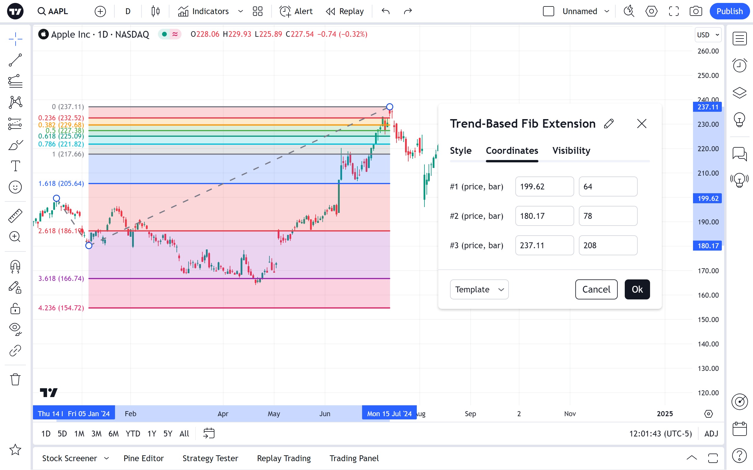 在图表上绘制斐波那契趋势扩展,标记可能重要的价格水平。这些水平基于斐波那契比率。