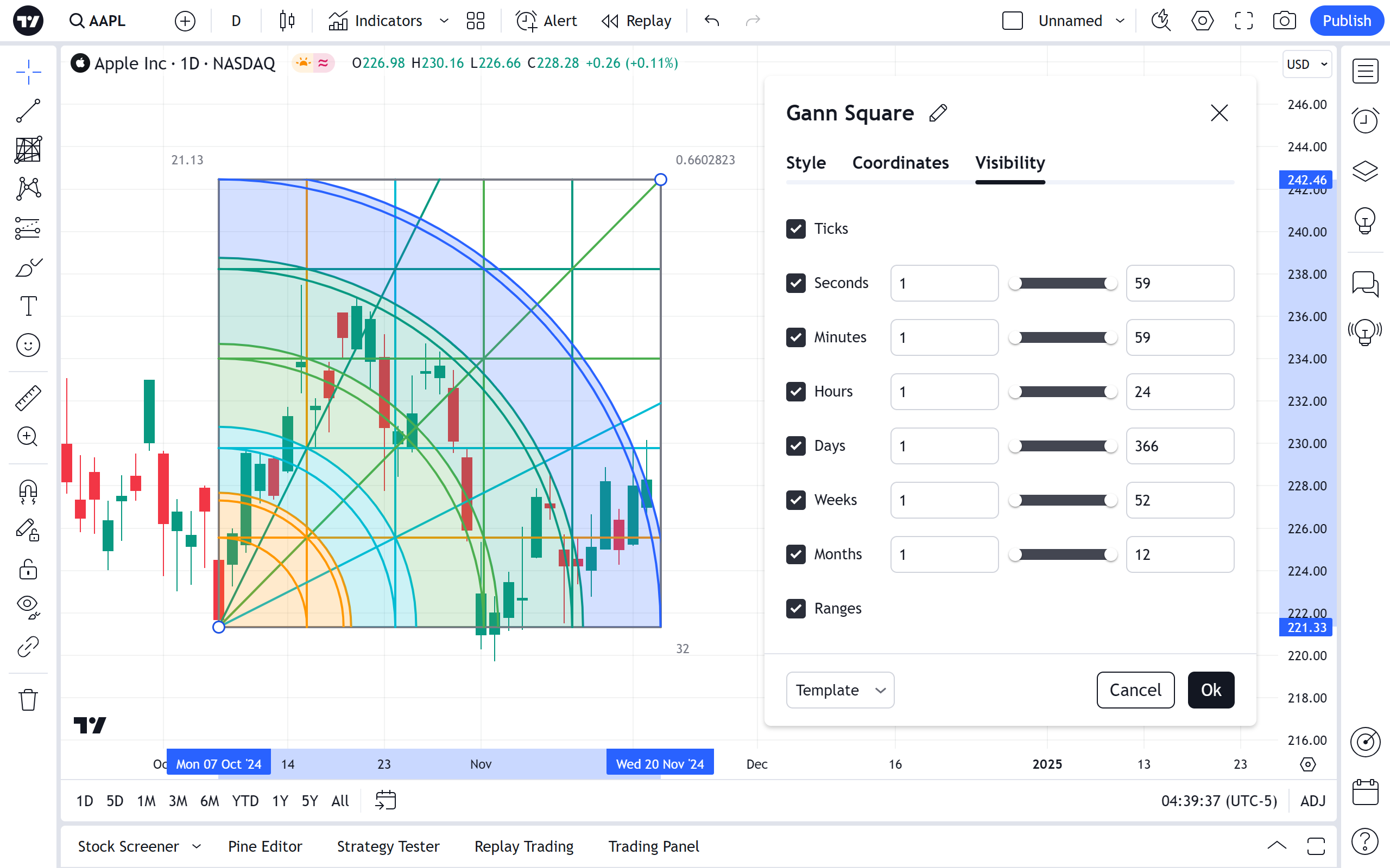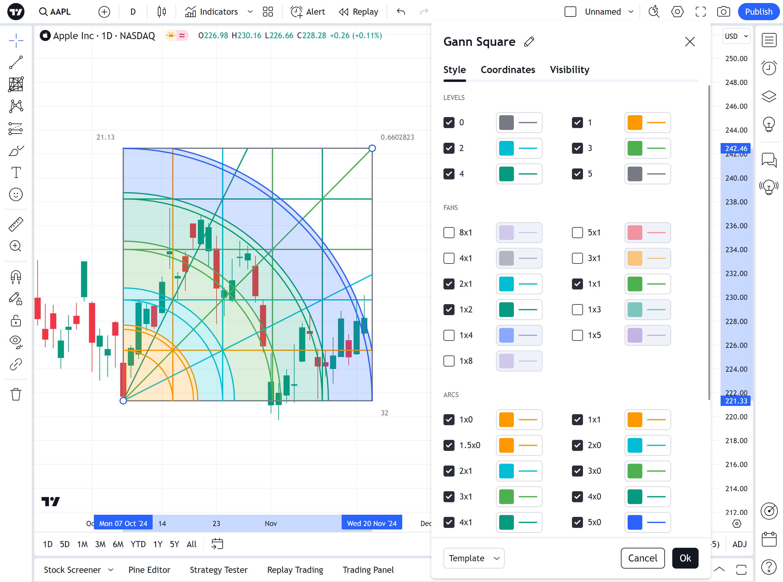 左侧的复选框切换江恩正方的附加线的可见性。 切换到它们的右侧可设置线条的颜色、不透明度和粗细。