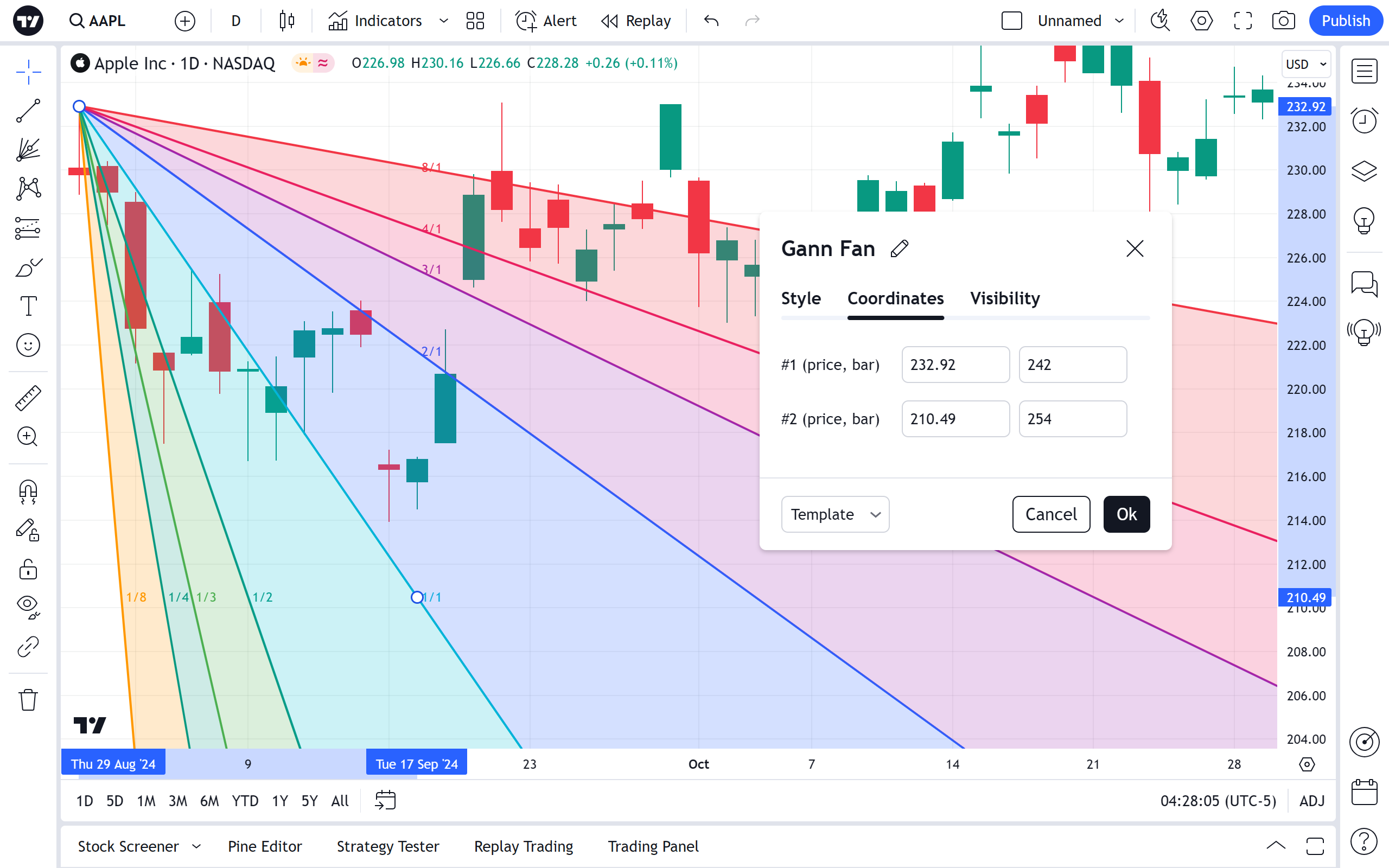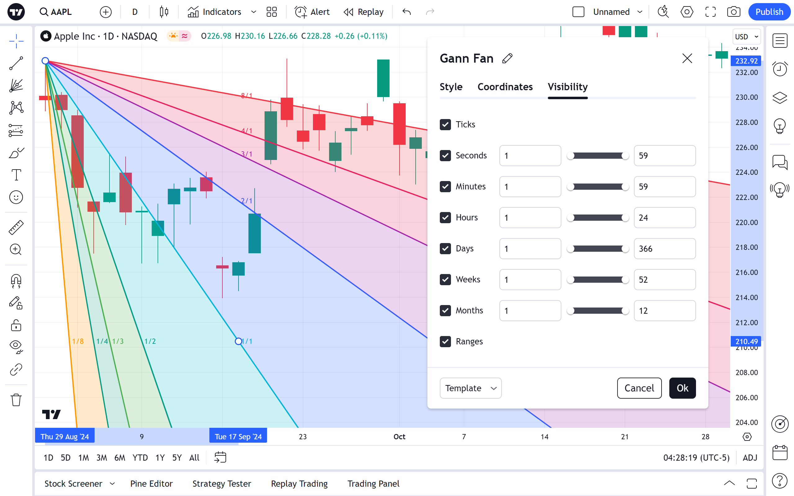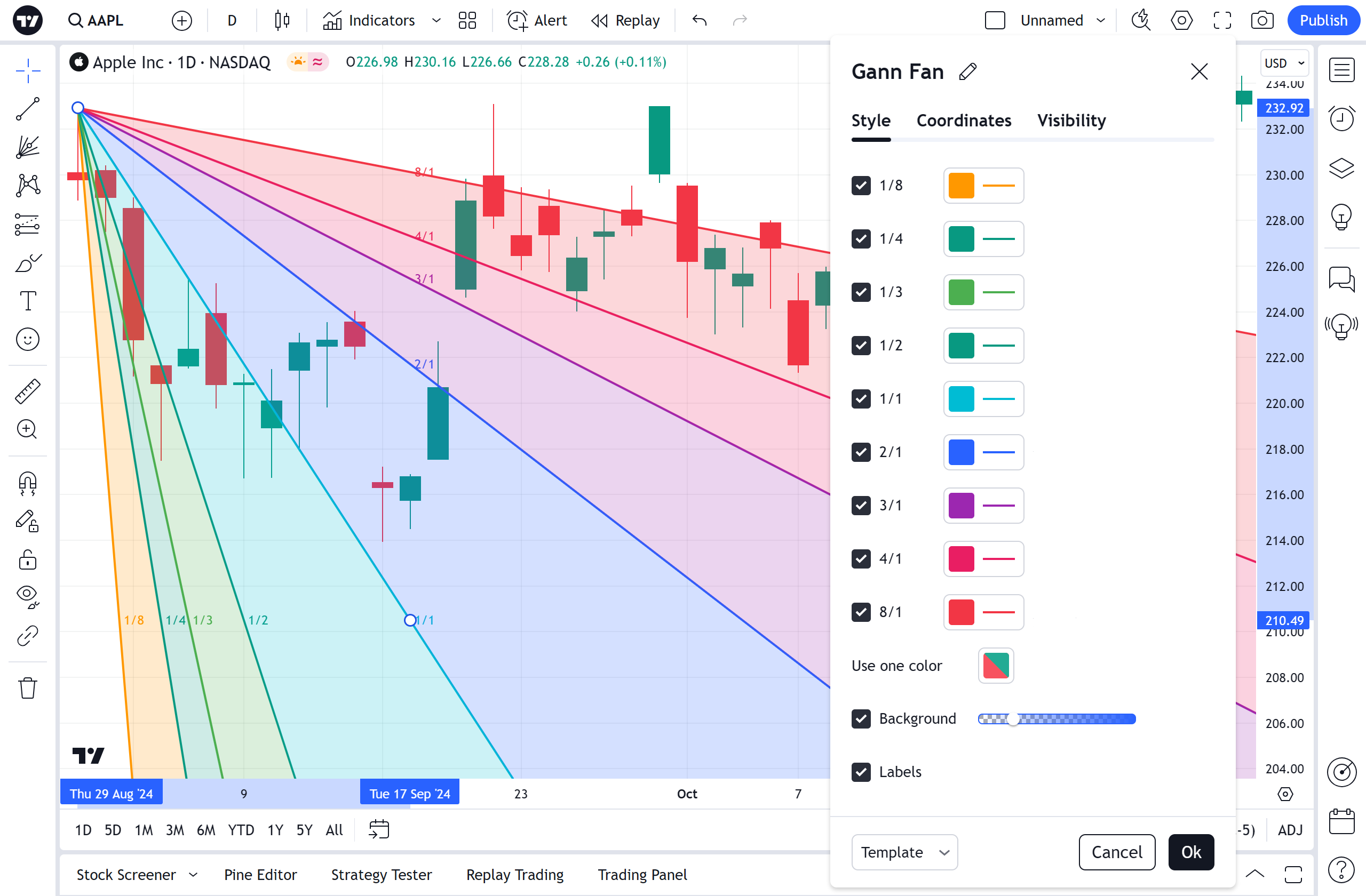 左侧的复选框切换江恩扇形的附加线的可见性。 它们右侧的开关可设置线条的颜色、不透明度、粗细和样式。