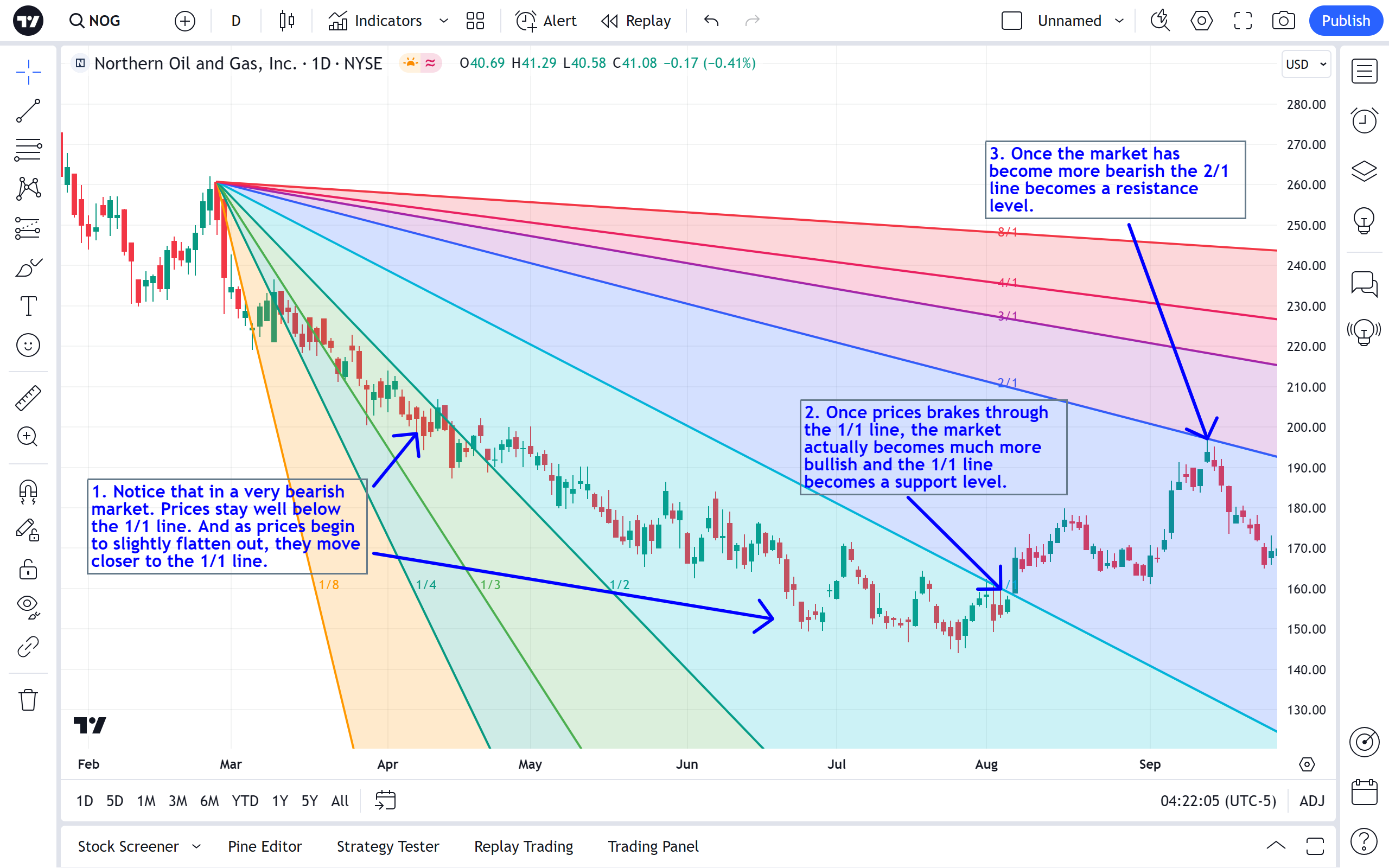 扇形通常从趋势或反转点(如顶部或底部)的变化中得出,是衡量市场趋势或强度的好方法。 在上升趋势中,如果价格保持在上升角度上方的空间内而没有跌破该角度,则市场被视为看涨。 在下降趋势中,如果价格保持在下降角度之下而没有突破它,则市场被视为看跌。
