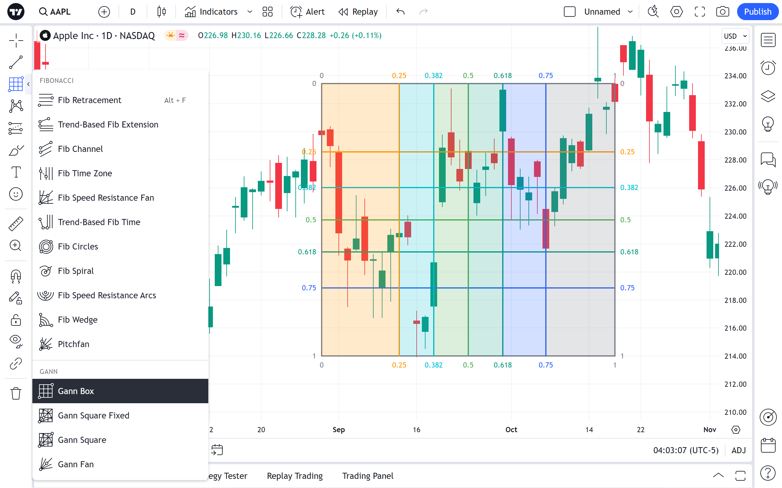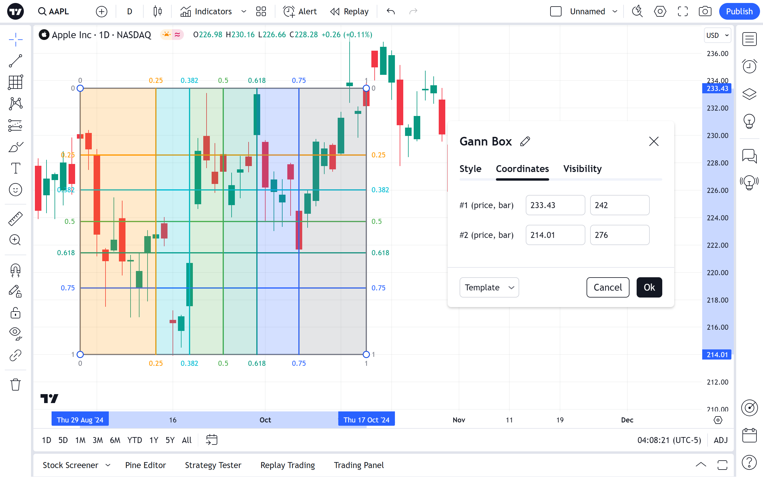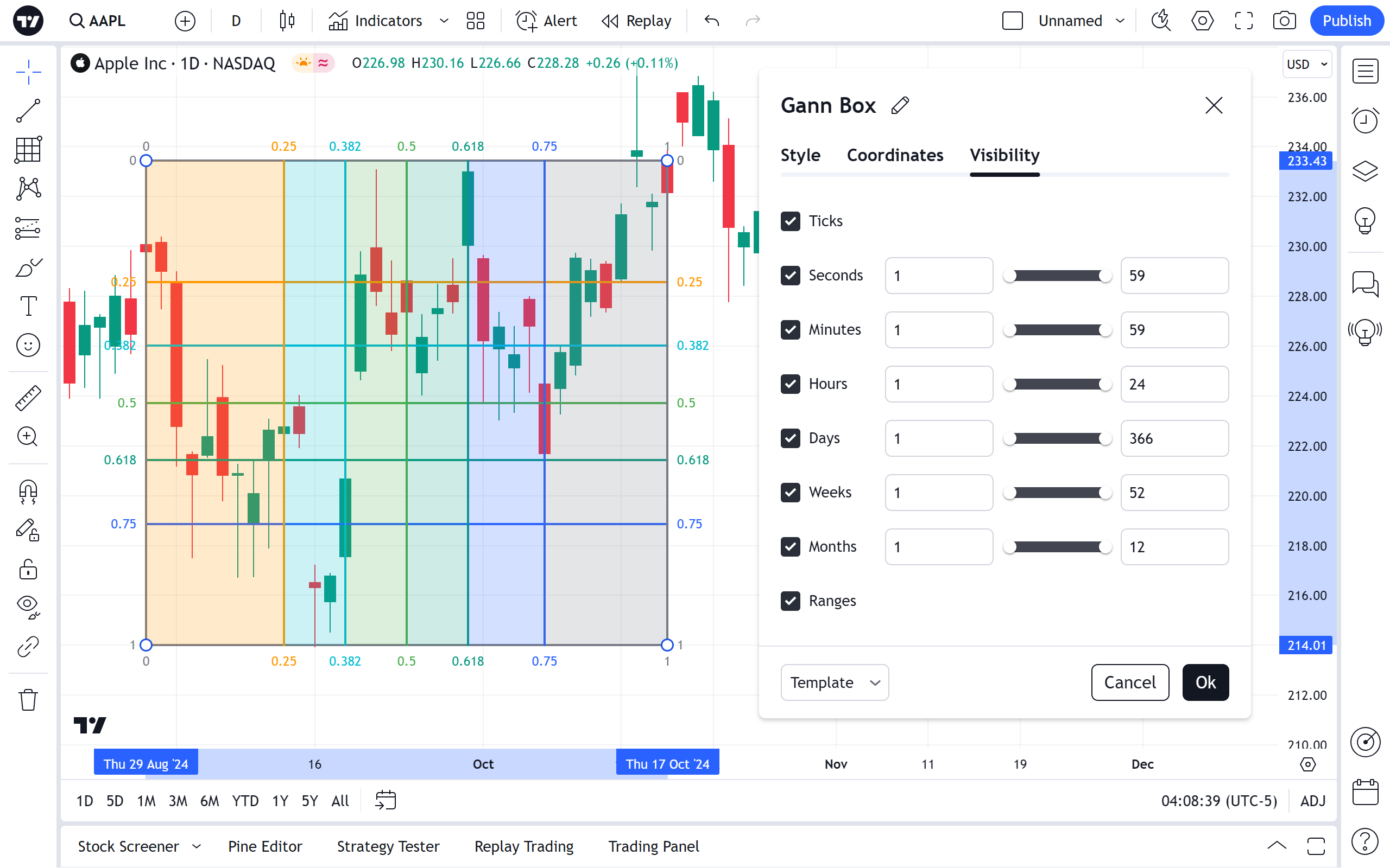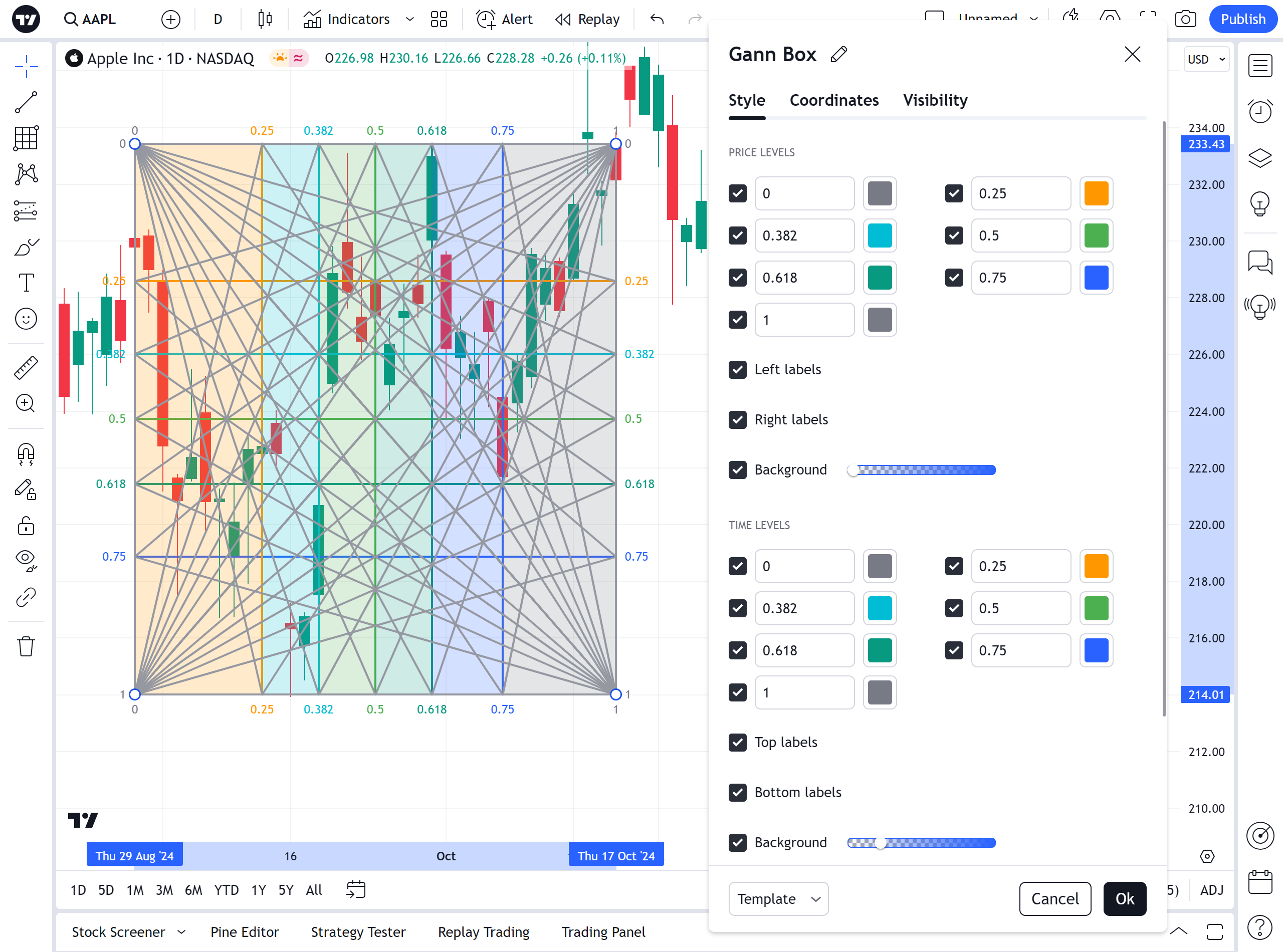 左侧的复选框可切换江恩箱的其他线条的可见性。 它们右侧的下拉菜单设置线条的颜色和不透明度水平。