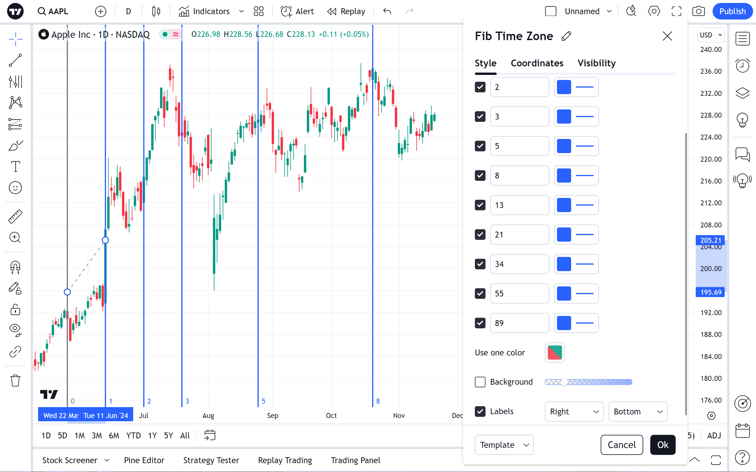 斐波那契时区是一种技术分析工具,由一系列沿时间(水平)轴延伸的垂直线组成。