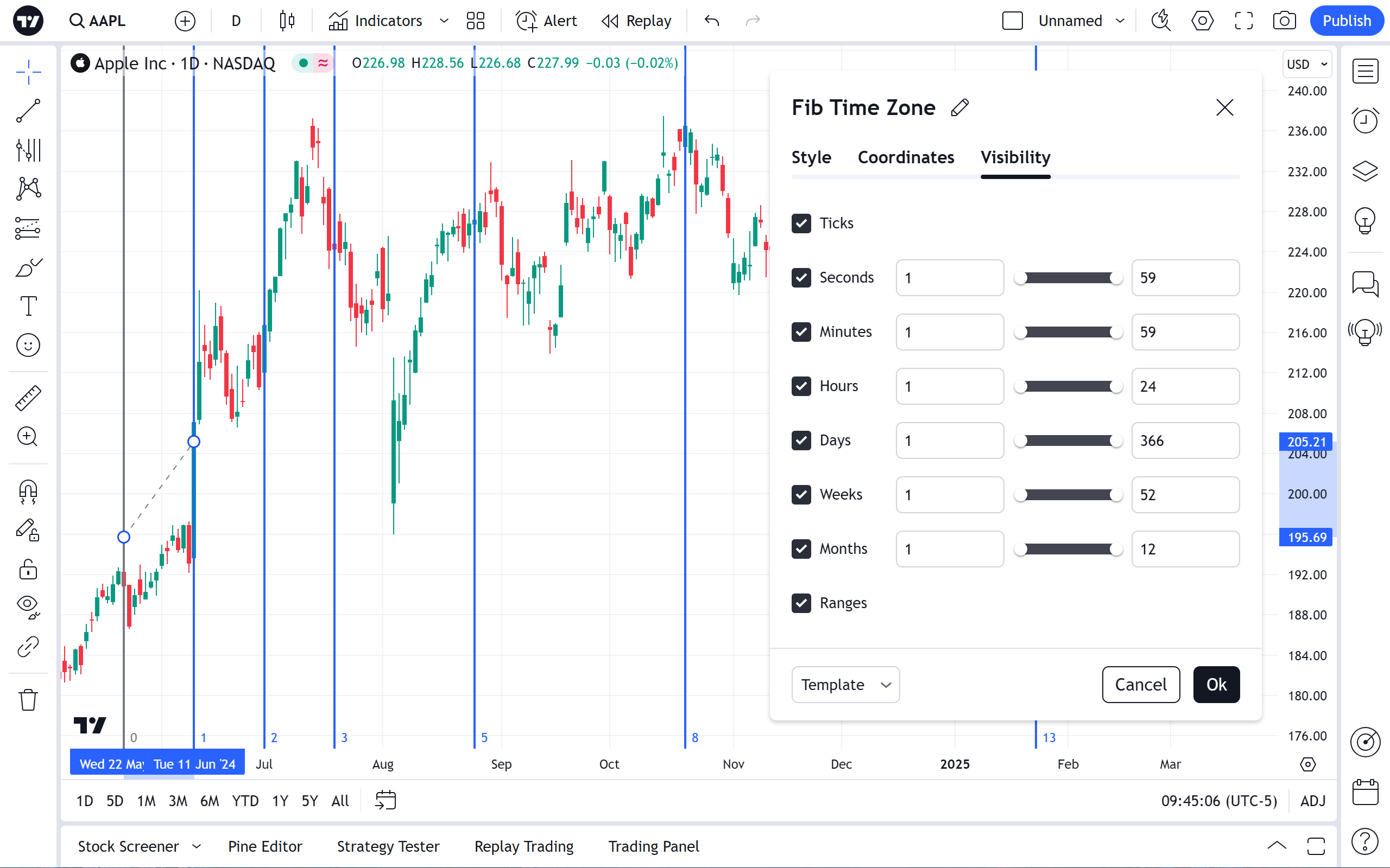 在可见性属性对话框中,您可以在不同时间周期的图表上切换斐波纳契时区的显示。