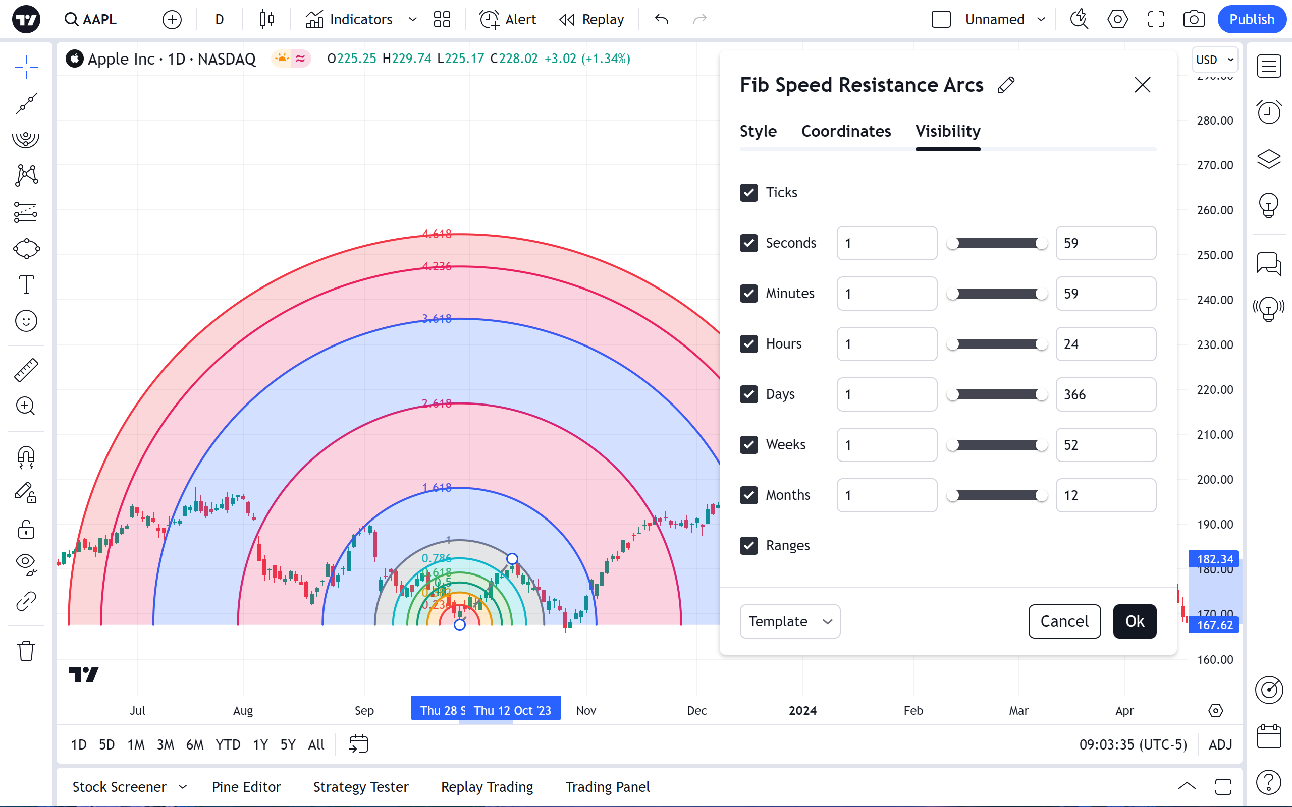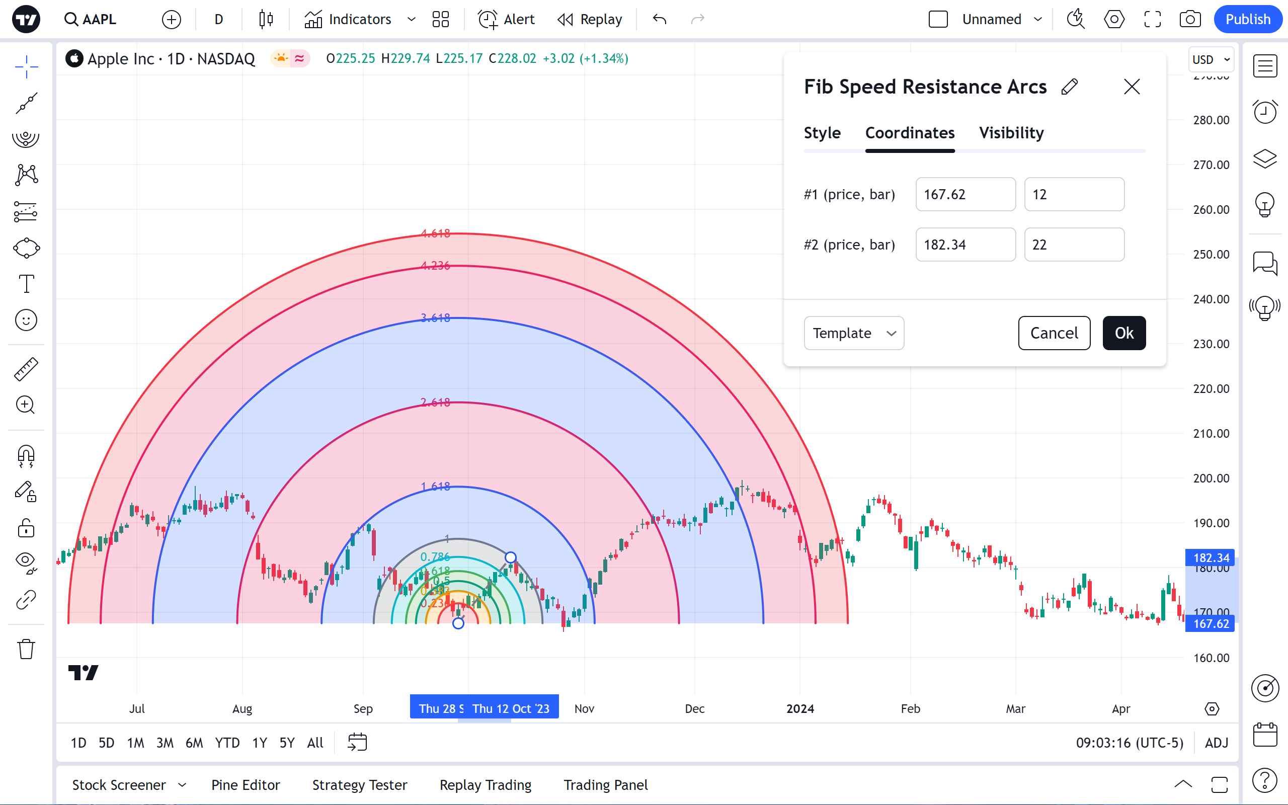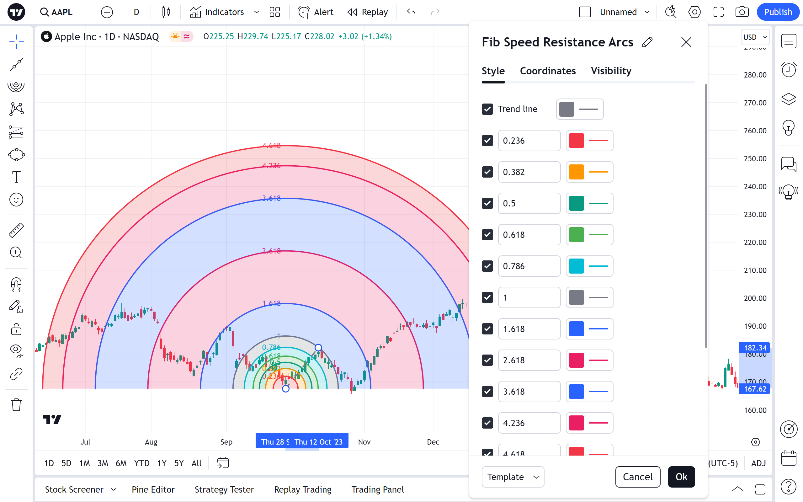 在样式属性对话框中,可以更改斐波那契速度阻力弧的外观和配置,并在需要时将这些自定义更改保存为模板: