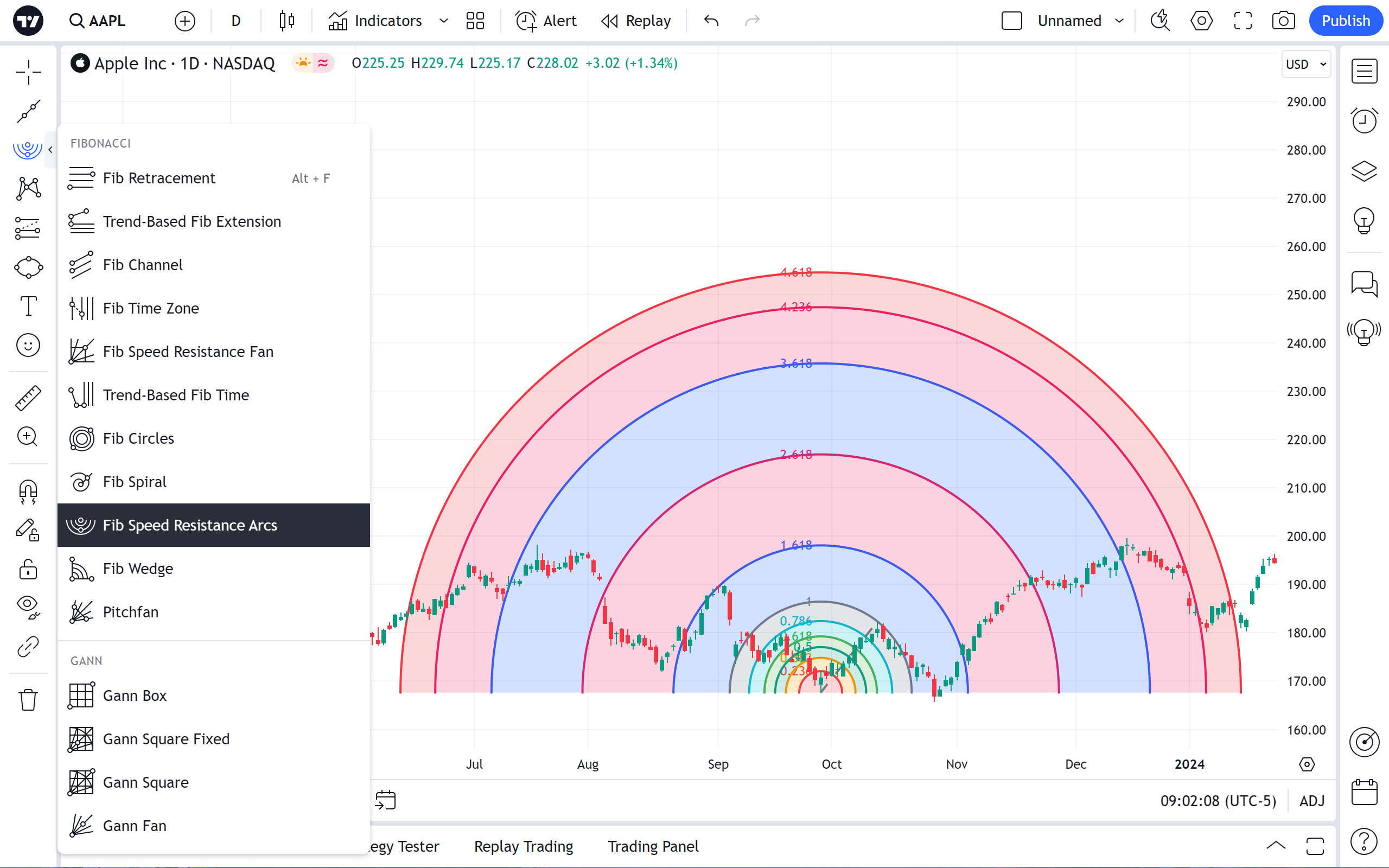 斐波那契速度阻力弧用于技术分析以确定趋势反转的方向和速度,并指示支撑/阻力位。第一步是在趋势的高点和低点之间画一条趋势线。 然后创建圆弧并以趋势线起点和终点之间选定的距离百分比与趋势/速度线相交。 使用典型的斐波那契百分比,但Nuvexlens允许用户手动选择他们希望使用的百分比(最多 11 个)。