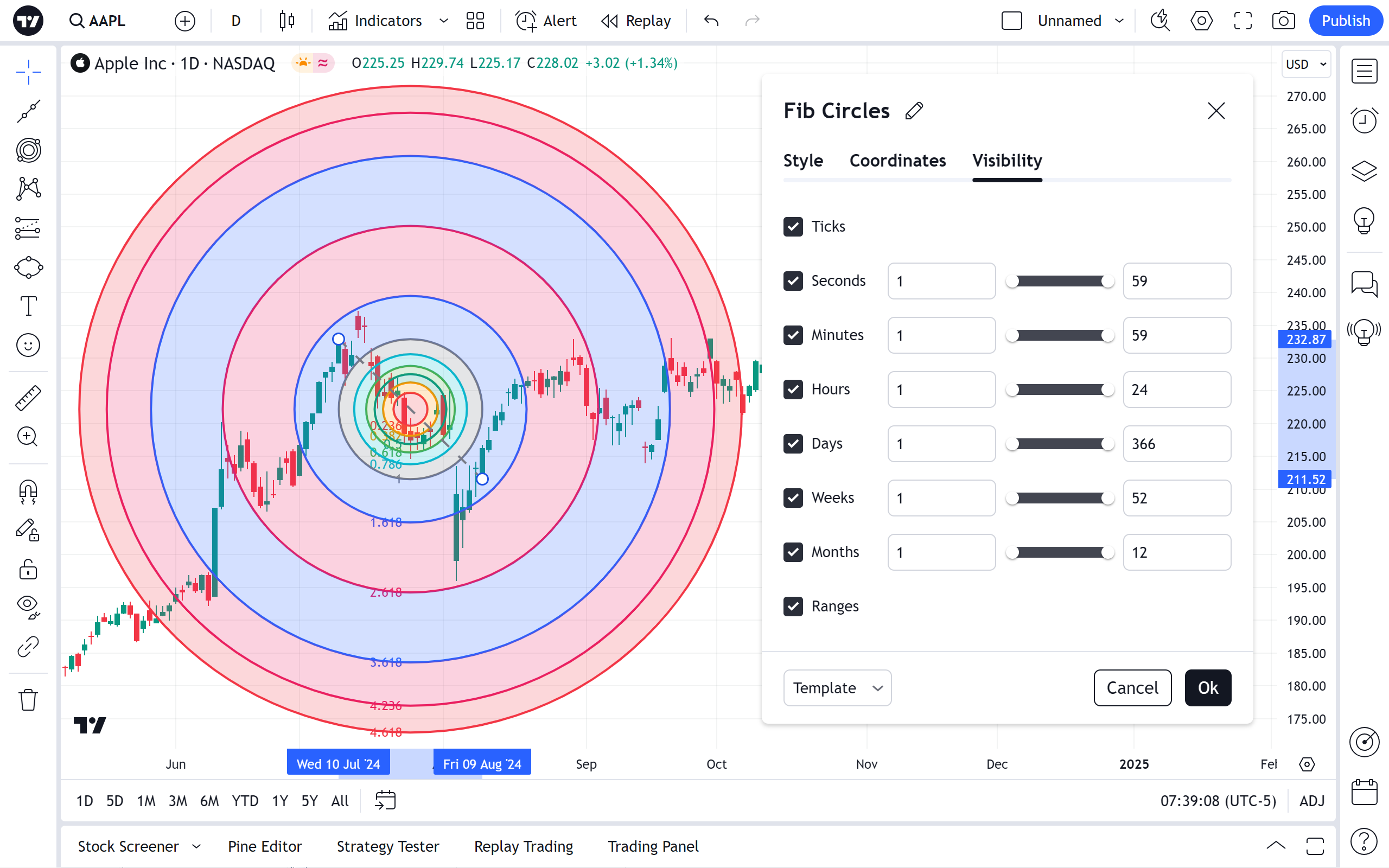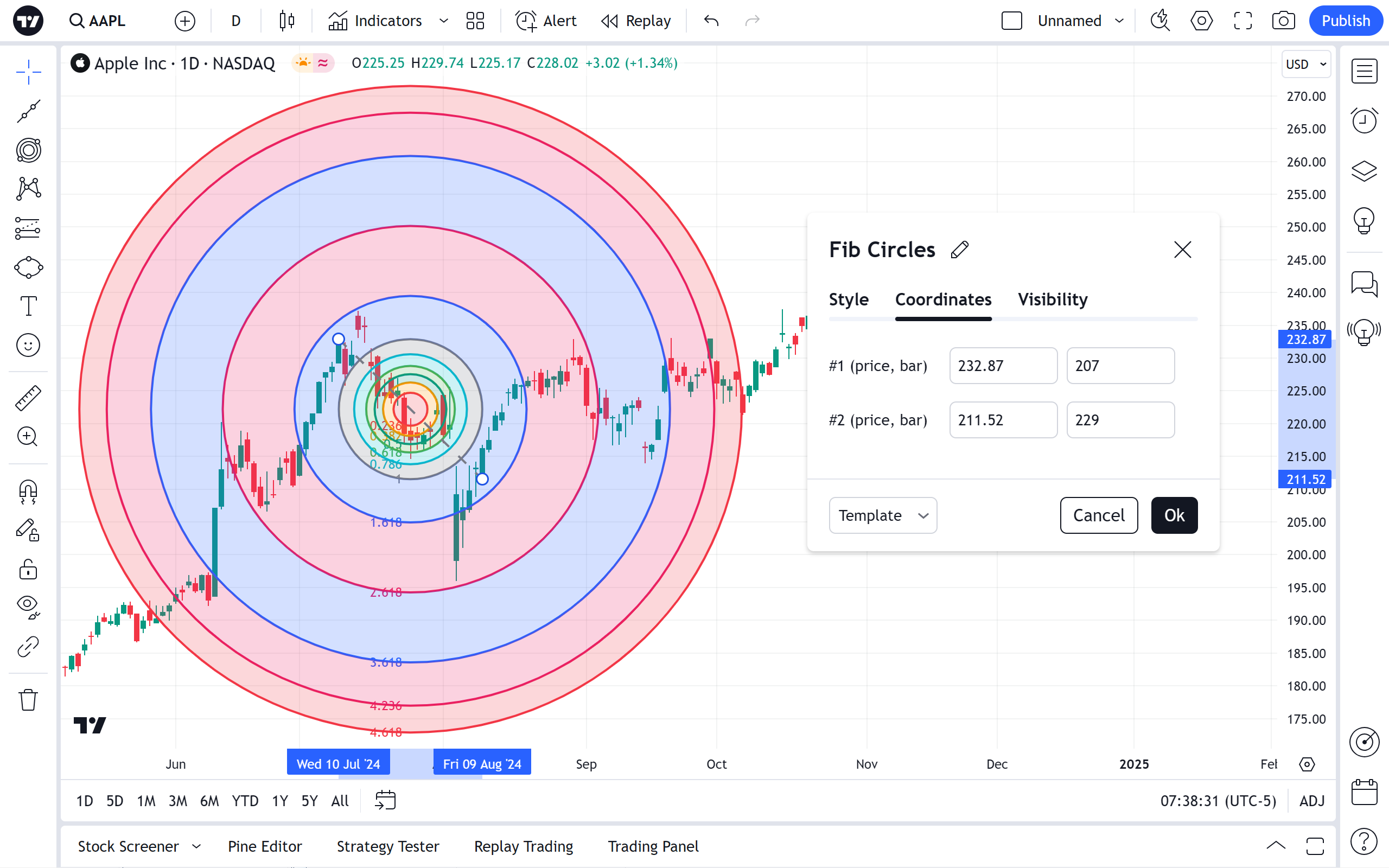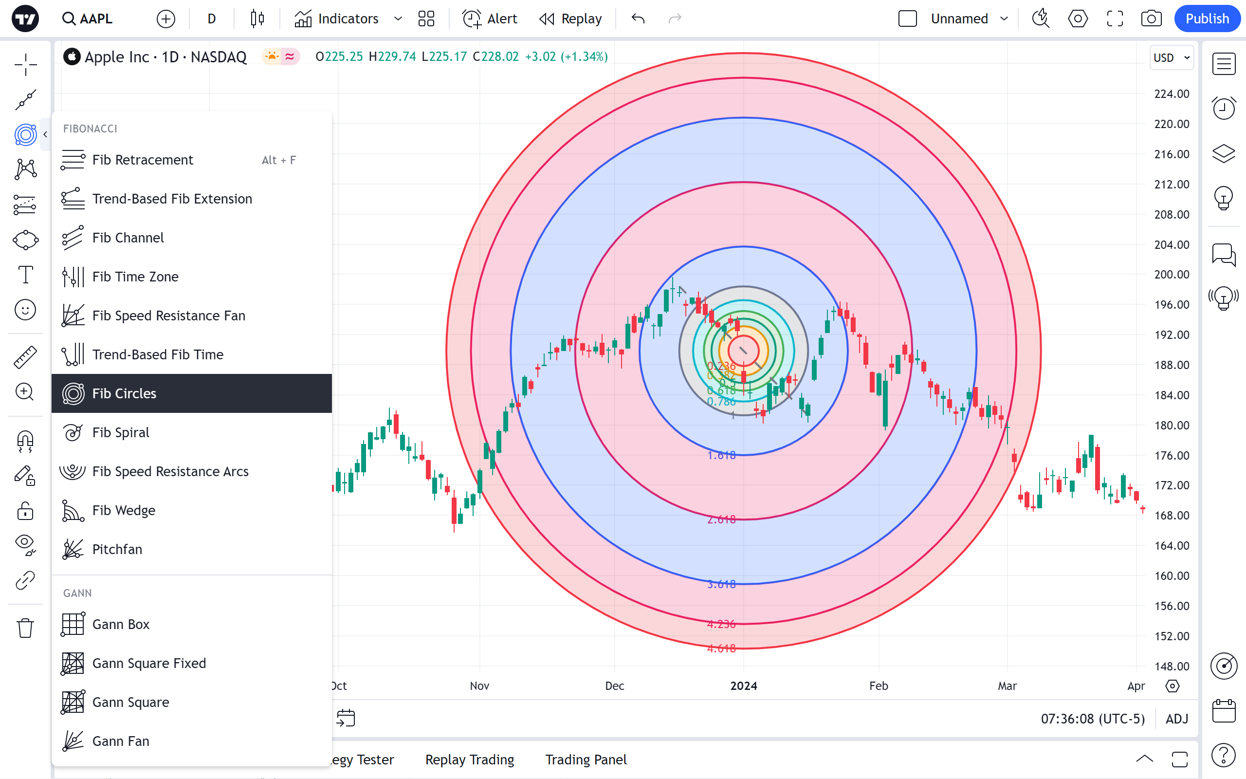 斐波那契圈是另一个基于技术分析中使用的斐波那契数列的指标。它是通过在两个极值点之间绘制趋势线创建的。要使趋势线倾斜 45 度,并且圆圈是完美的圆形,请在绘制时按住 Shift 键。
