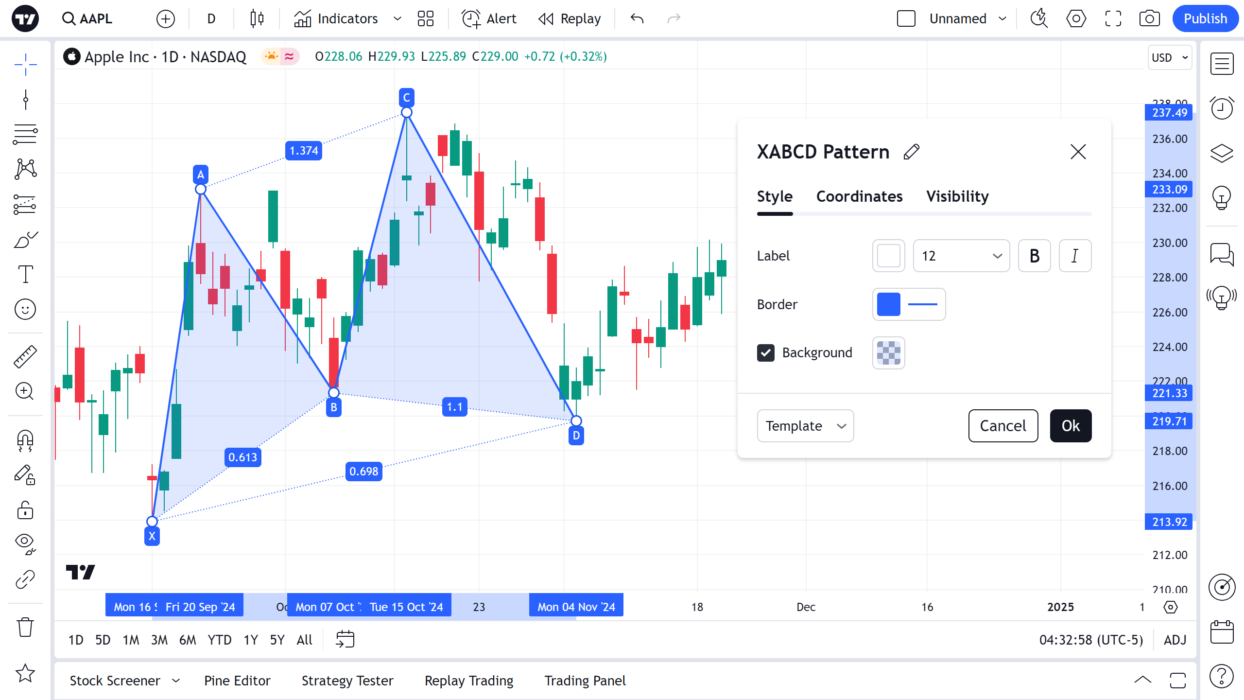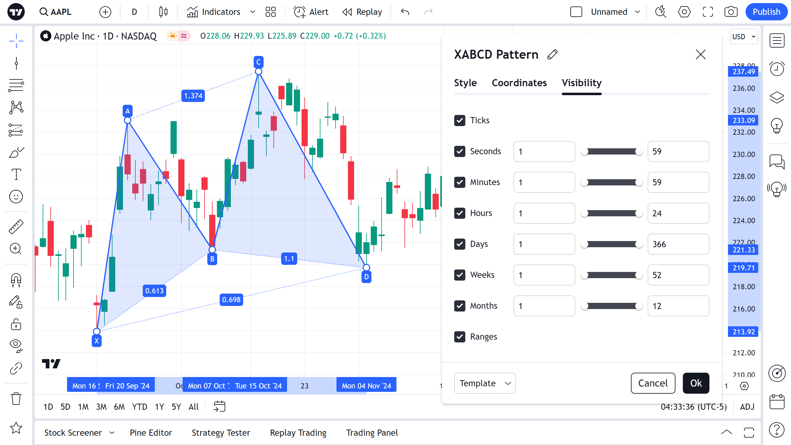 在可见性属性对话框中,您可以切换 XABCD 形态在不同时间周期图表上的显示。