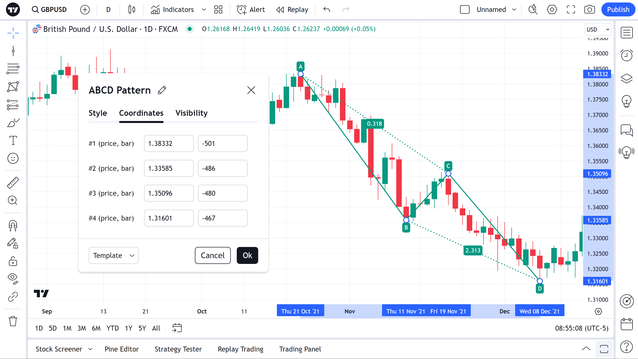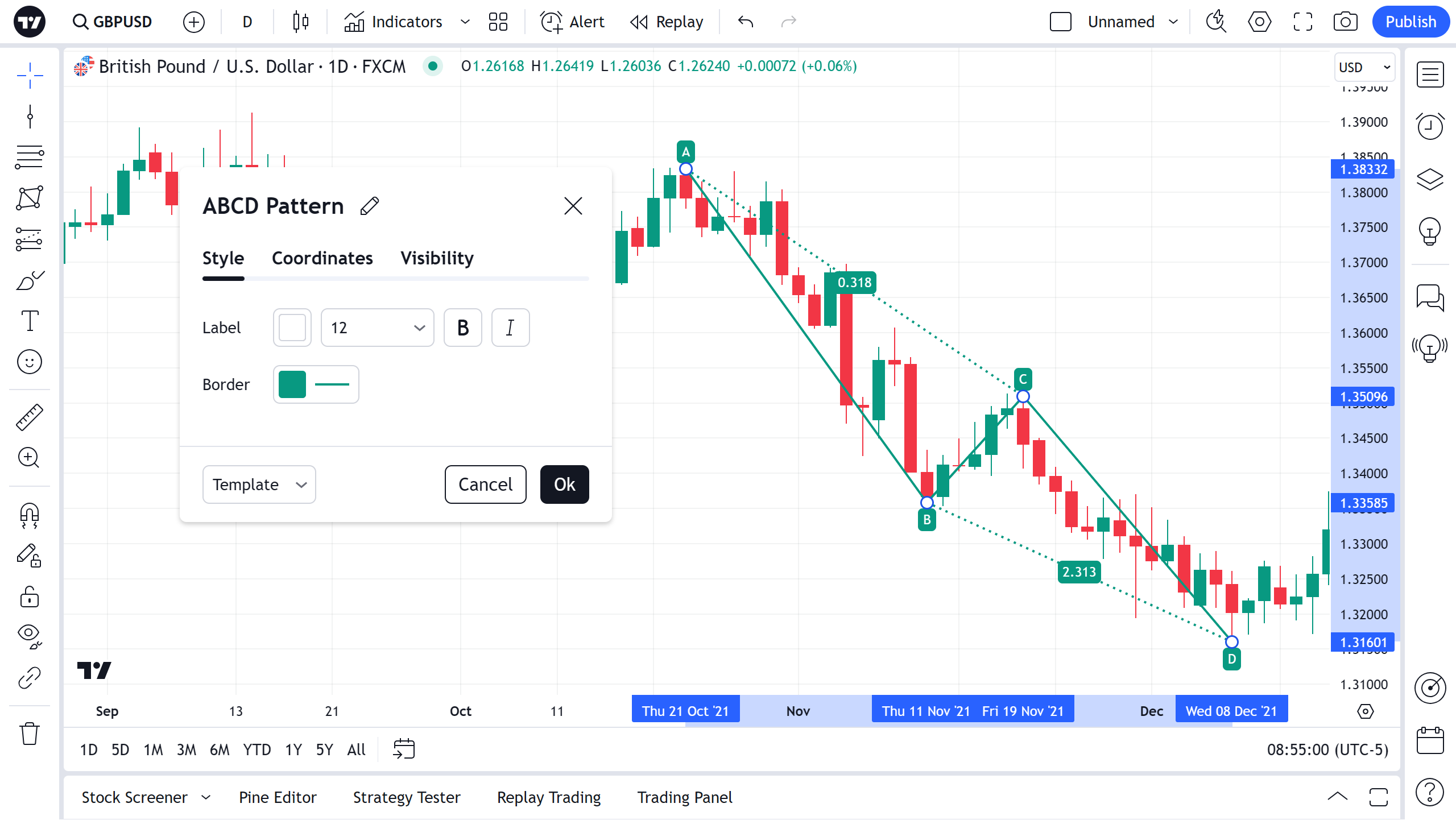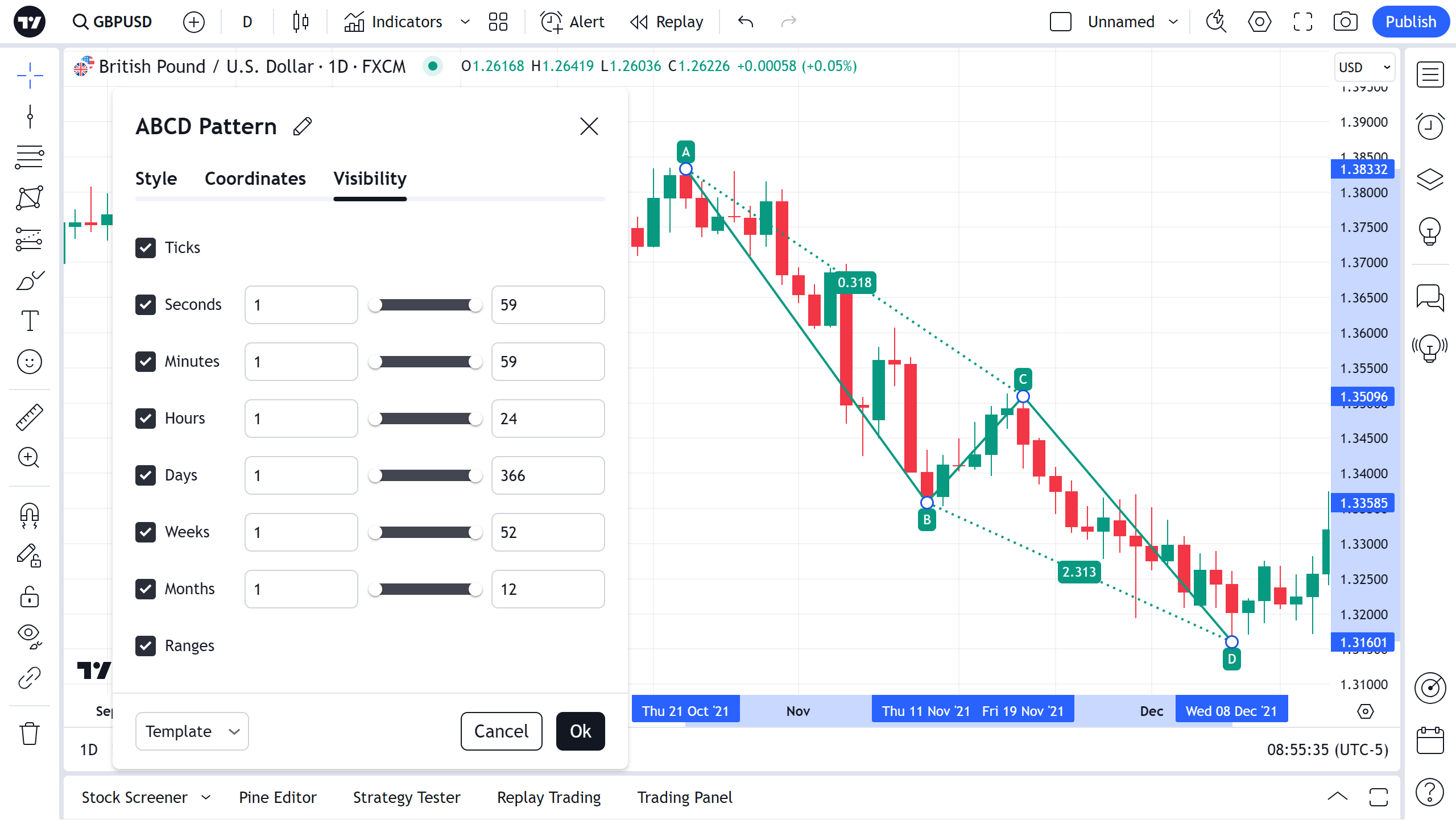 在可见性属性对话框中,您可以切换显示在不同时间周期的图表上的ABCD工具: