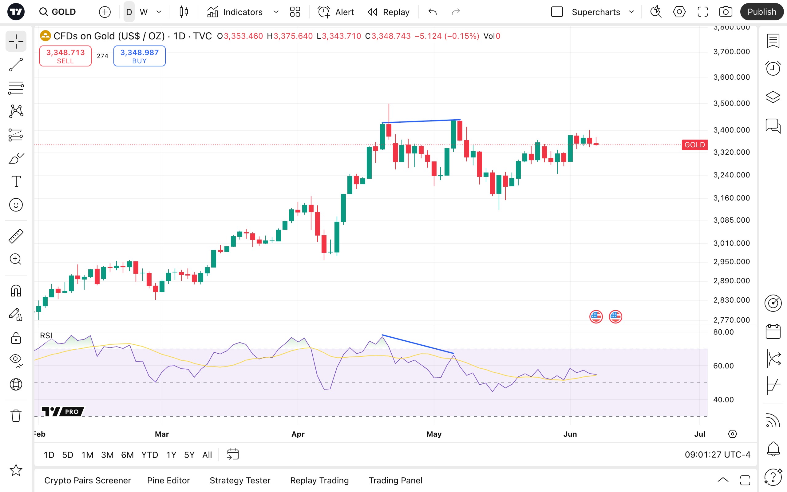 绘图工具可用作价格和指标的叠加层。例如,您可以绘制价格和RSI的趋势线来发现背离。