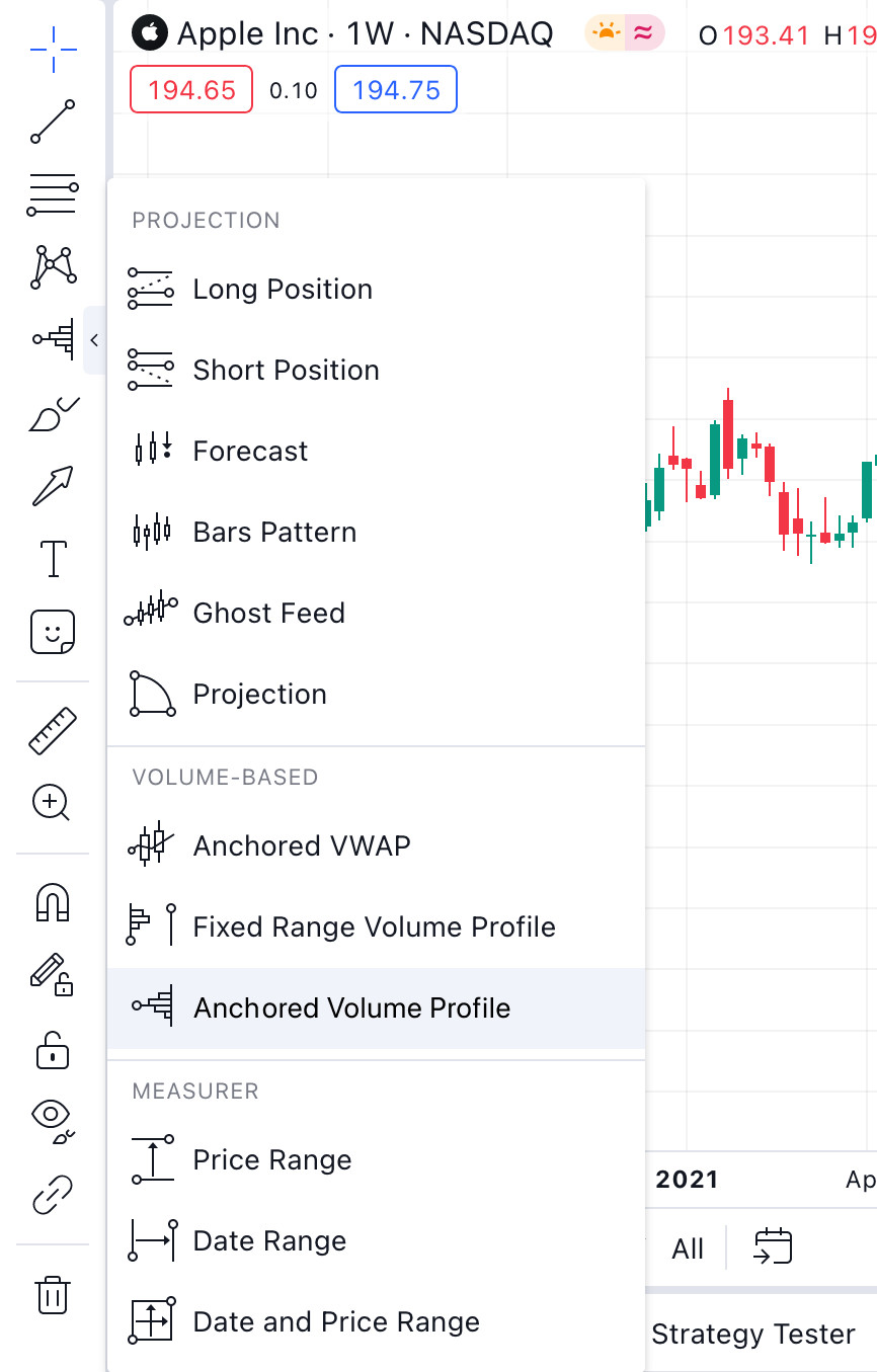 1. 从图表左侧面板的绘图工具列表中选择“锚定成交量分布图”,如下所示。