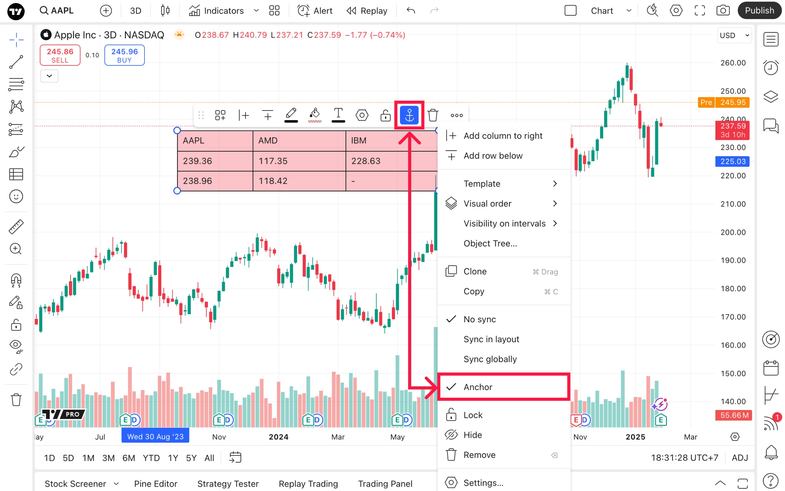 表格可以锚定到屏幕上的特定点。这意味着无论数据系列向前或向后滚动多远,表格都会在图表上可见。要启用此模式,请单击工具栏上的锚点图标,或从上下文菜单中选择“锚点”选项。