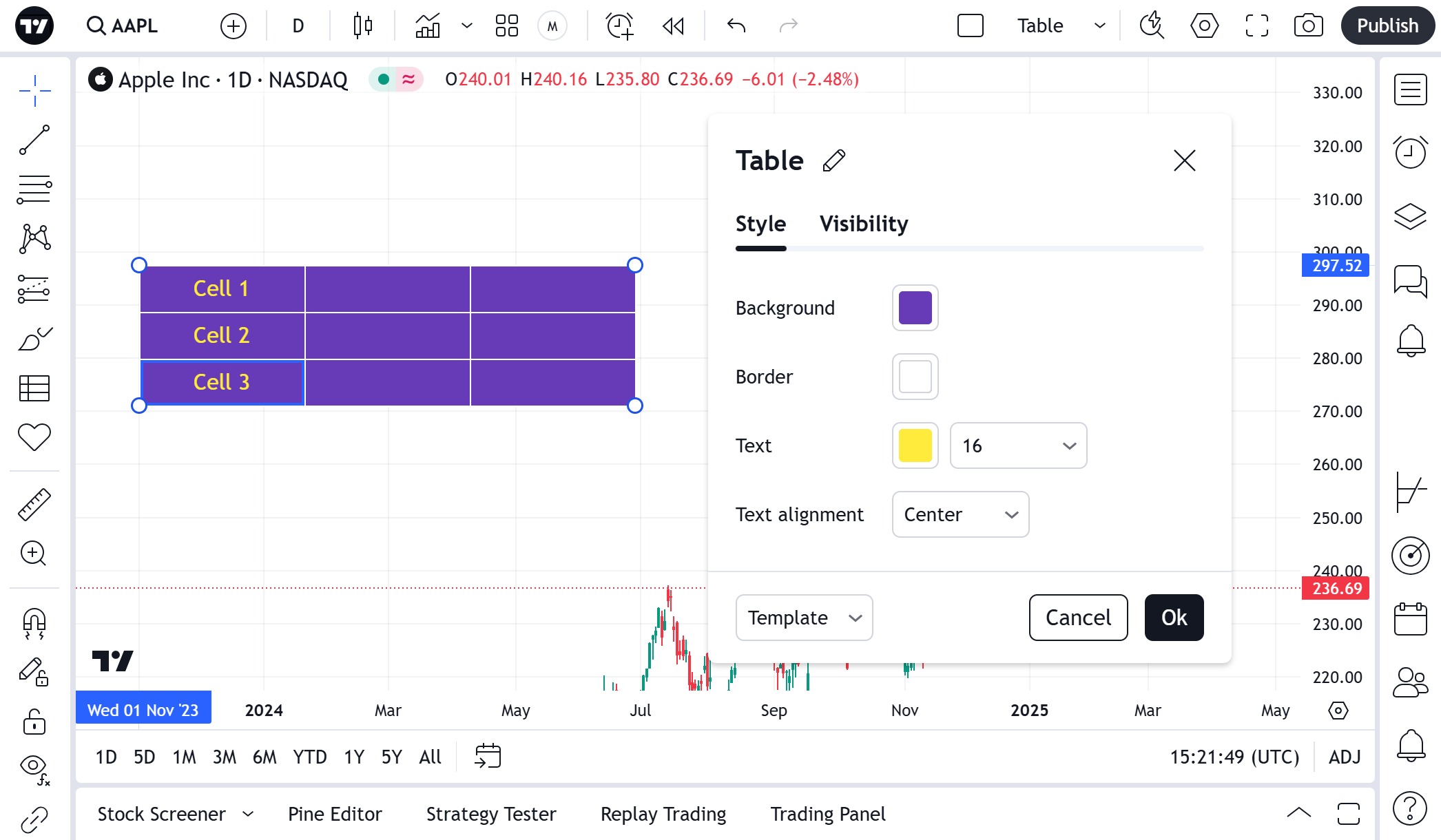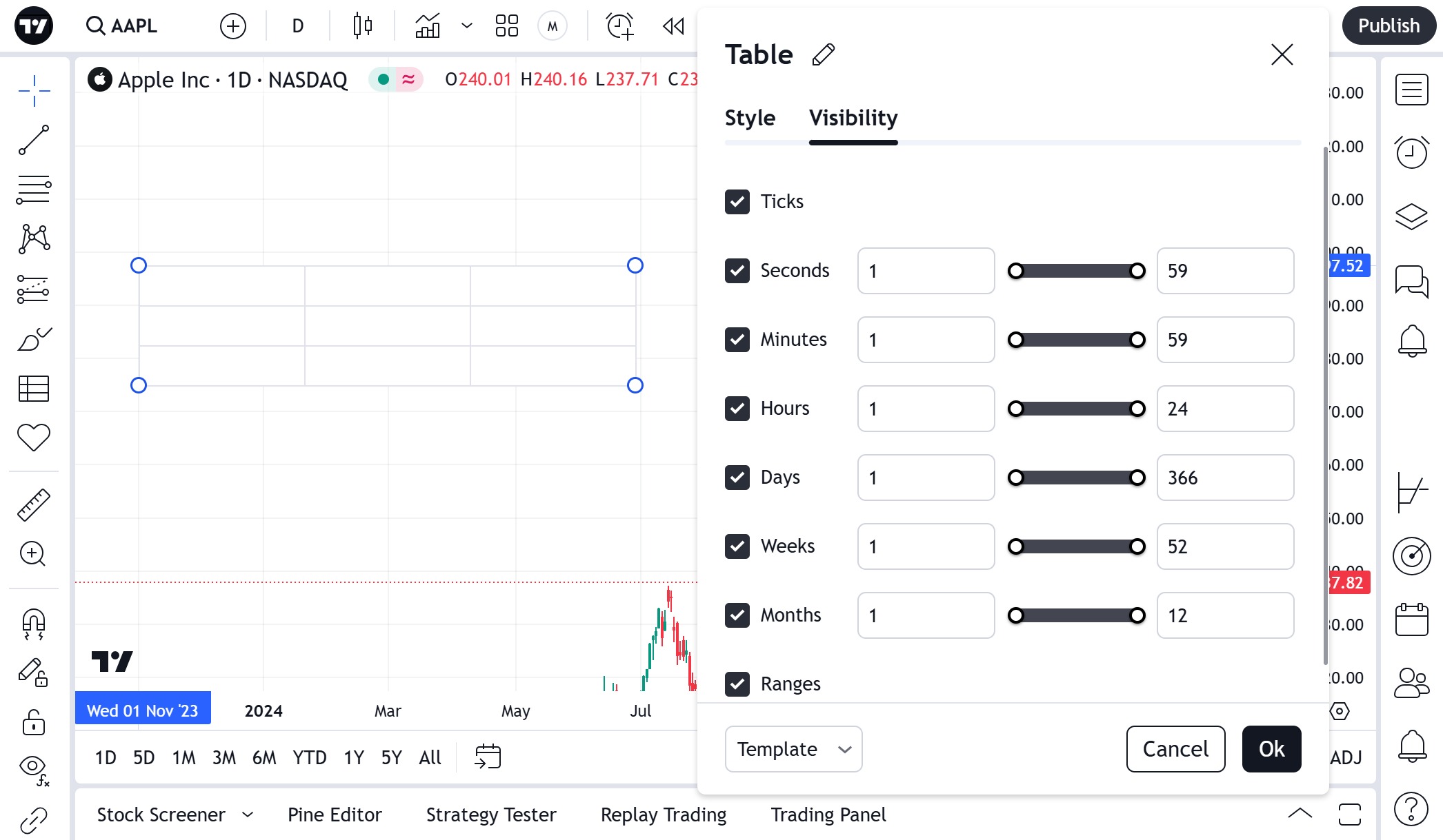 在设置窗口的“可见性”标签页上,您可以配置表格在图表上显示的时间周期。