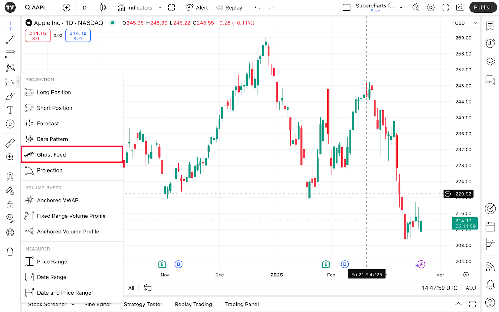 要开始使用,请在图表左侧的绘图工具栏上找到“预测和测量”工具,然后选择“模拟K线”。