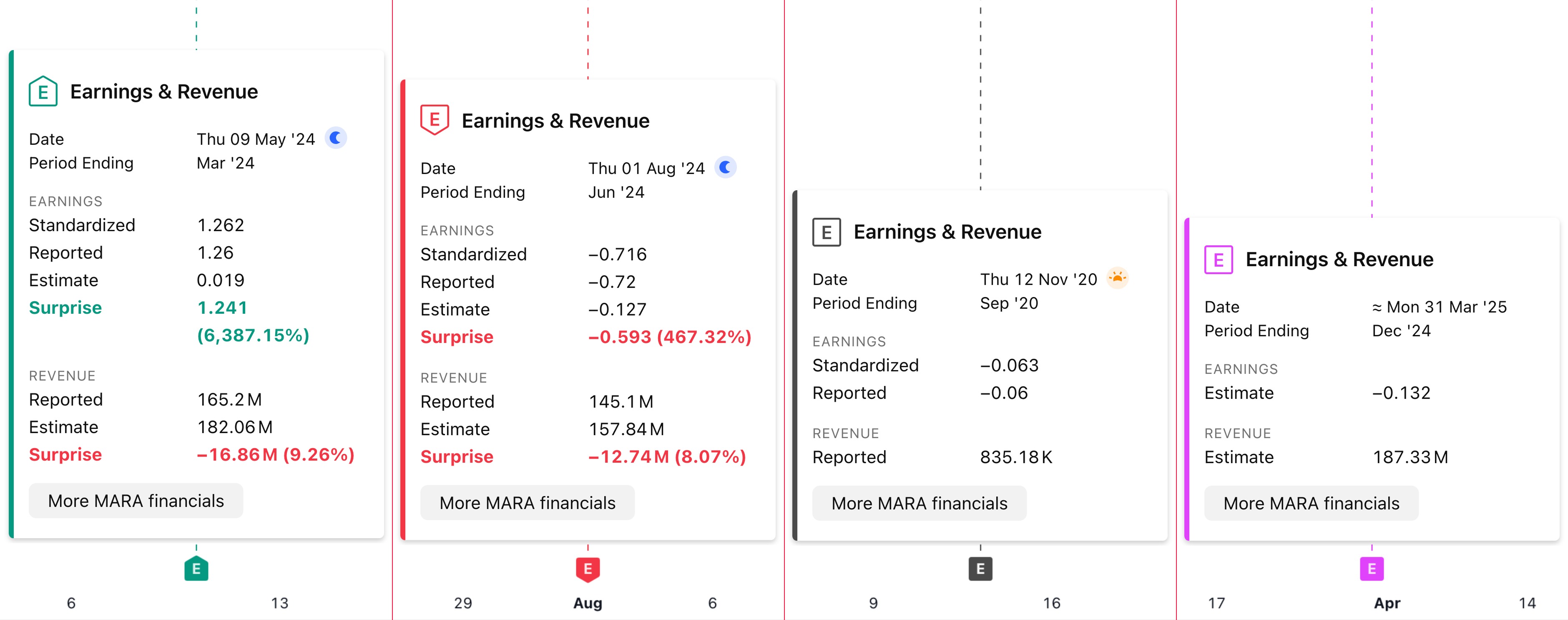 在图表上,收益用E图标表示。它们沿着报告日期的X轴放置。收益图标的颜色和形状取决于超预期值。
