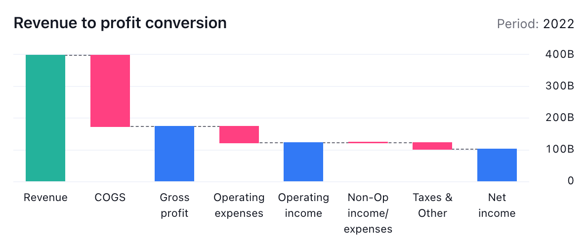 分析公司财务表现的最有用工具之一是收入或利息收入到利润的瀑布转换。这种方法通过图形化地总结财务报表来显示公司如何赚钱。它帮助我们了解公司如何从其核心业务活动中赚钱以及它在各种费用上花费了多少。