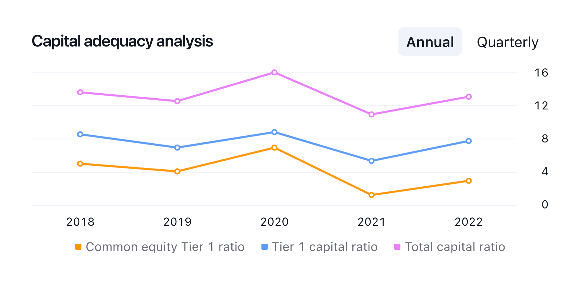 这是总资本与RWA的比率。总资本包括T1资本加上二级(T2)资本,这是一种质量较低且流动性较差的资本形式。它由次级债务、累积优先股和某些类型的混合证券组成。巴塞尔协议III要求的最低总资本比率为8%。