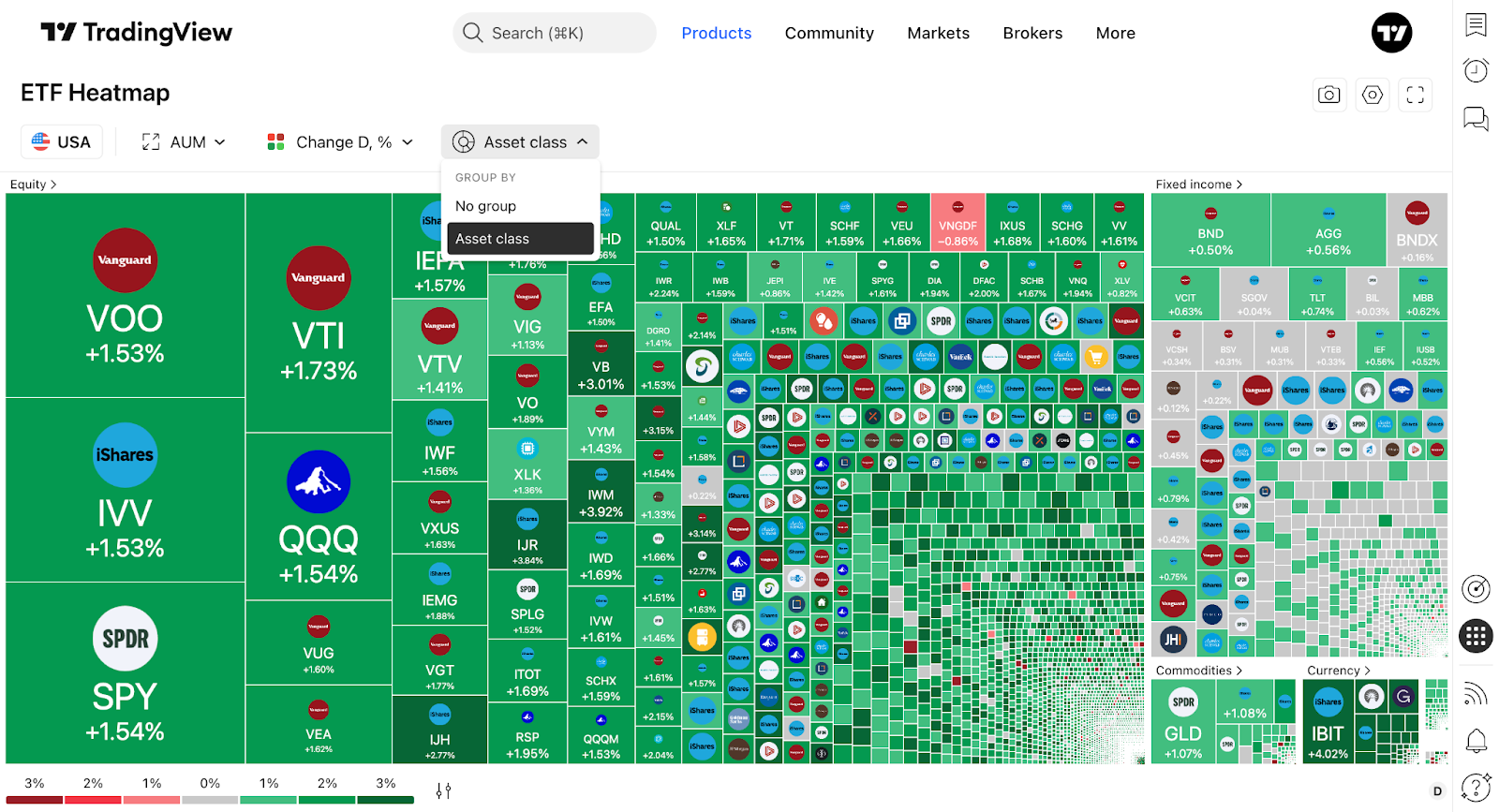 - 经典模式(分组):单元格颜色和大小各异,资产按类别分组(股票按行业板块,ETF 按资产类别)。