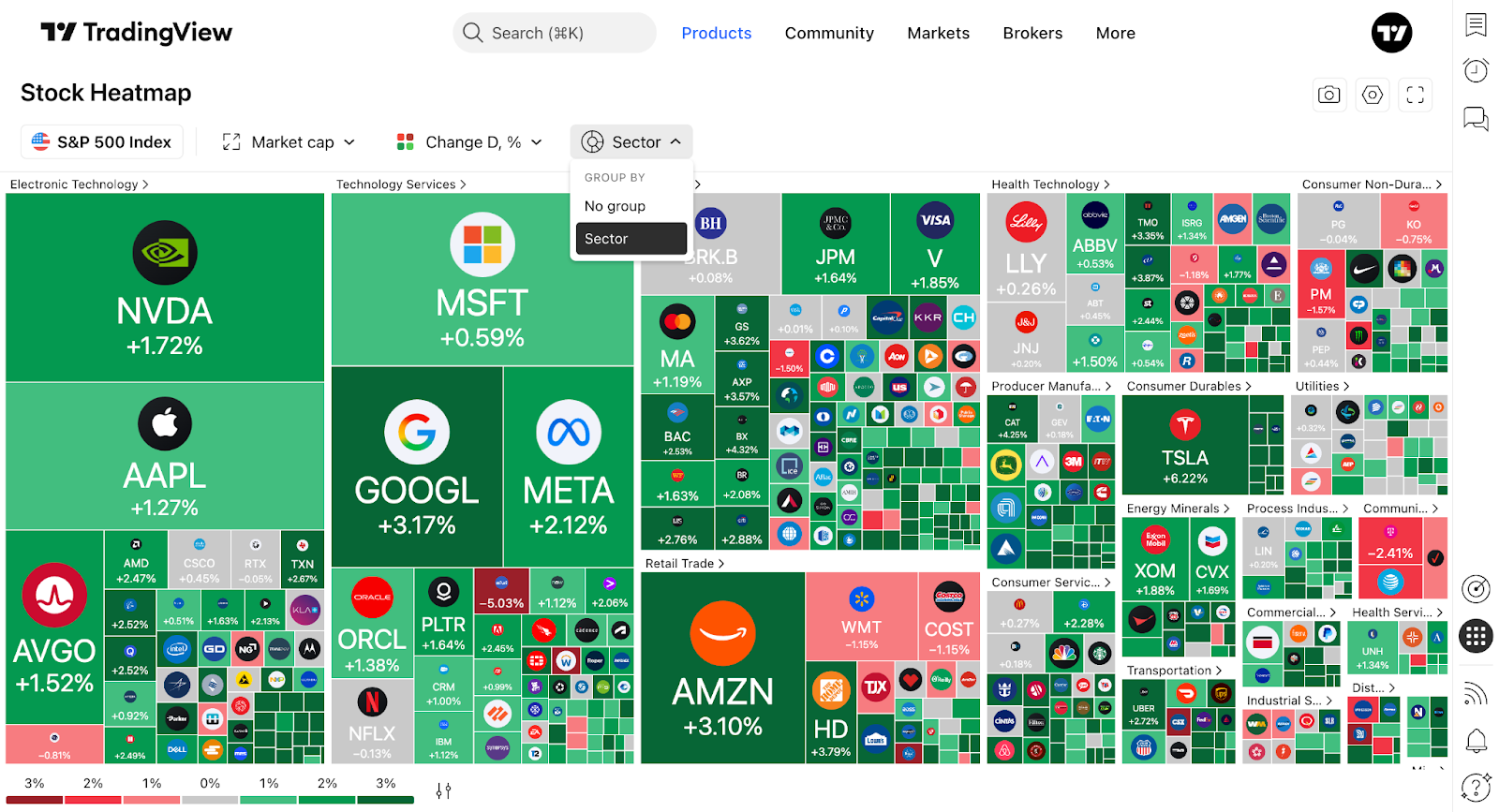颜色反映了资产动态:增长/下跌、表现、波动性以及其他参数。亮度和色调有助于快速识别领涨股和落后股。