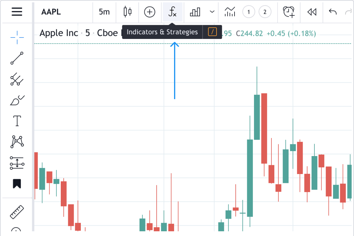 可以在“指标”对话框中找到所有可用指标。 单击顶部工具栏中的“指标 (Indicators & Strategies) ”按钮,开始输入指标的名称,然后单击对话框右侧的指标以启用它。