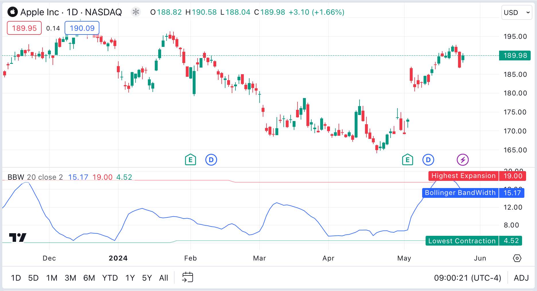 - BBW下跌。(在下面的示例中,阈值是9%,但这根据不同的证券以及不同的时间周期而有所变化)。