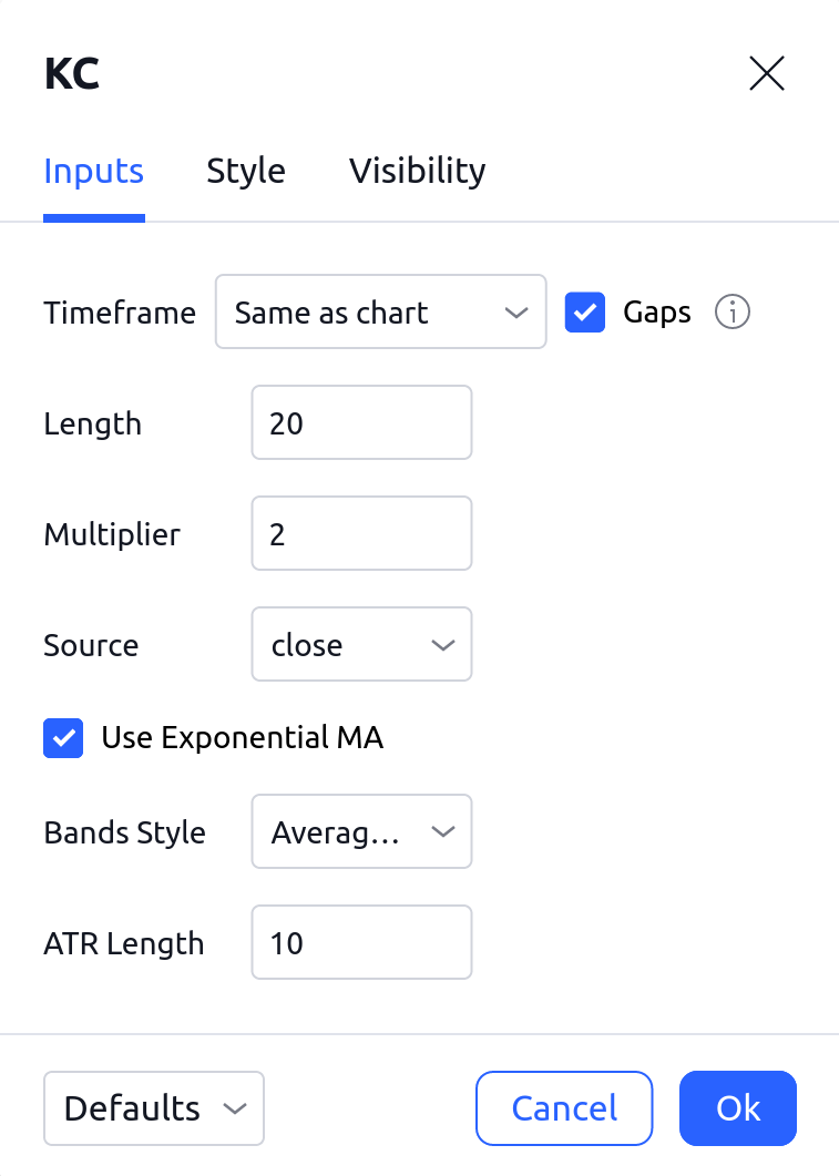 在此示例中,我们将使用20周期EMA,其上、下轨使用平均真实波幅(ATR)和乘数2: