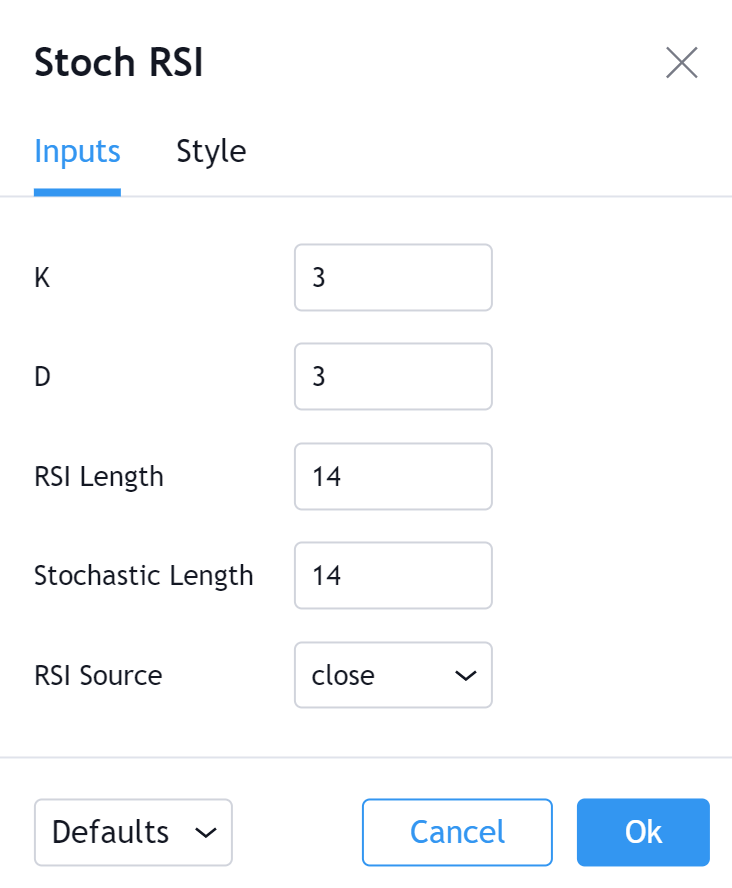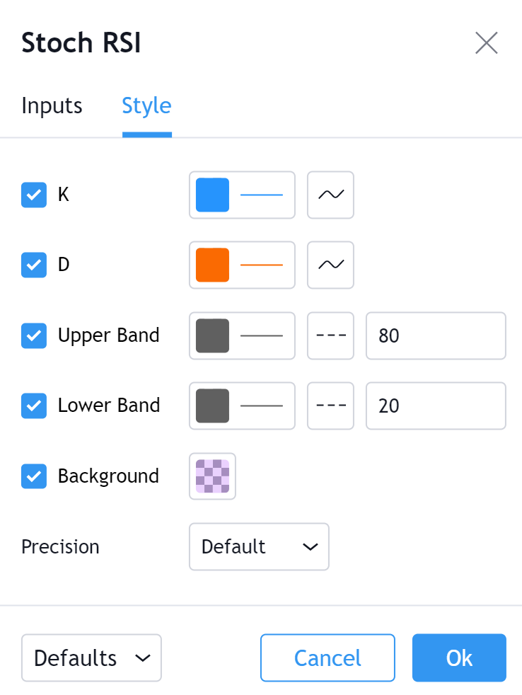 可以切换 %K 的可见性以及显示 %K 实际当前值的价格线的可见性。 还可以选择 %K 线的颜色、线宽和视觉样式(默认为线条)。