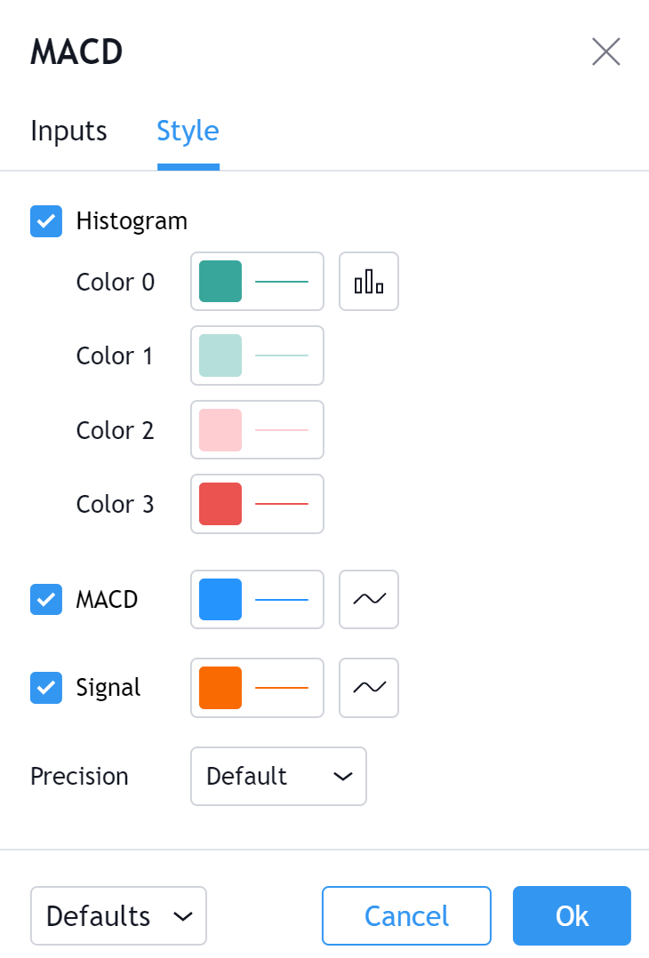 可以切换 MACD 线的可见性,以及显示 MACD 线当前实际值的价格线的可见性。还可以选择 MACD 线的颜色、线条粗细和视觉类型(线是默认值)。