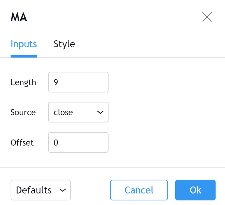 可以切换 MA 的可见性,以及显示 MA 实际当前值的价格线的可见性。还可以选择 MA 的颜色、线条粗细和线条样式。