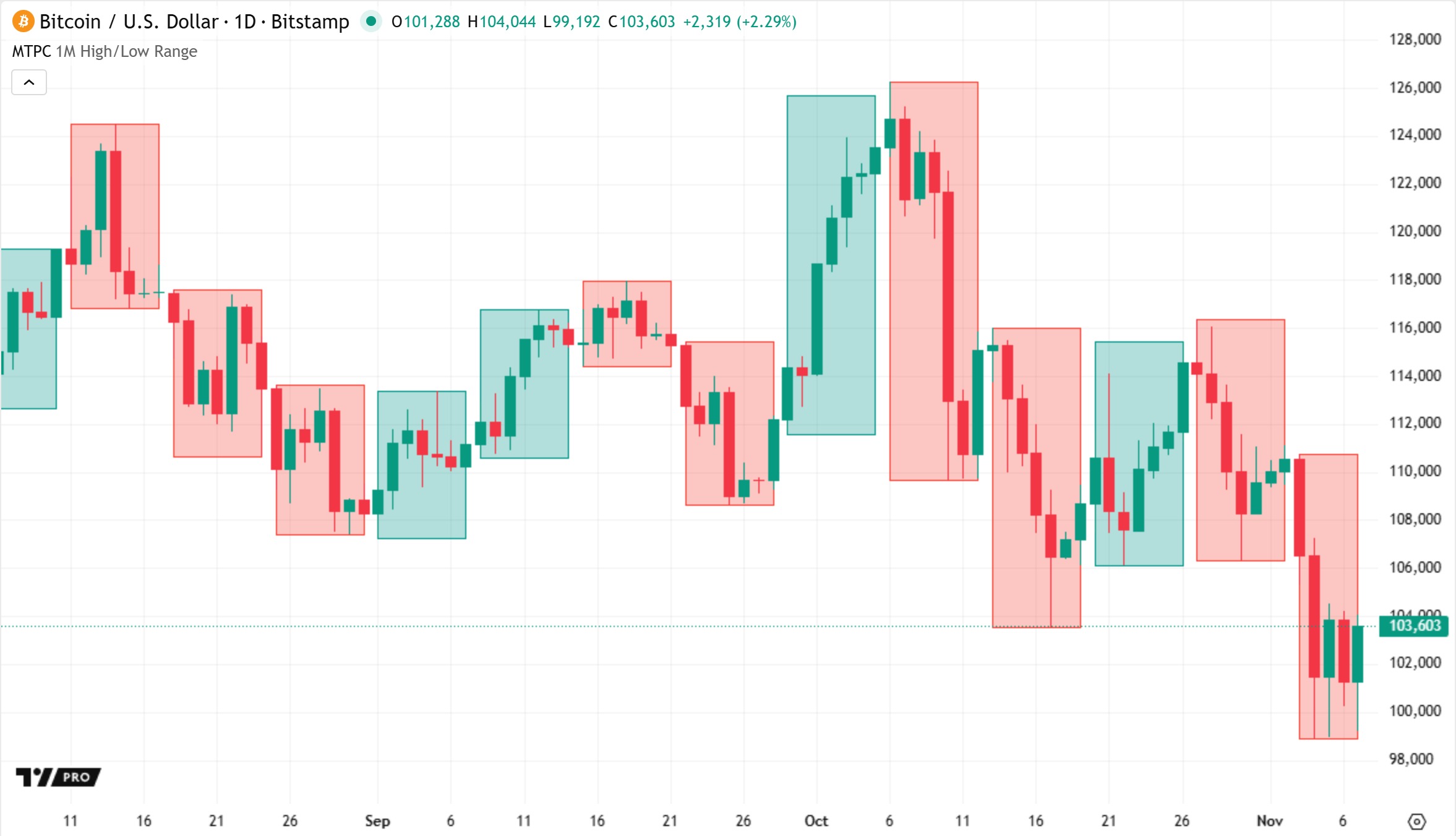多时间周期图表 (MTPC) 指标直接在图表上显示来自更高时间周期 (HTF) K线图的数据。它根据标准价格或平均K线图值绘制代表 HTF 范围的彩色方框,从而无需更改图表的时间周期或类型即可进行多时间周期柱状图分析。