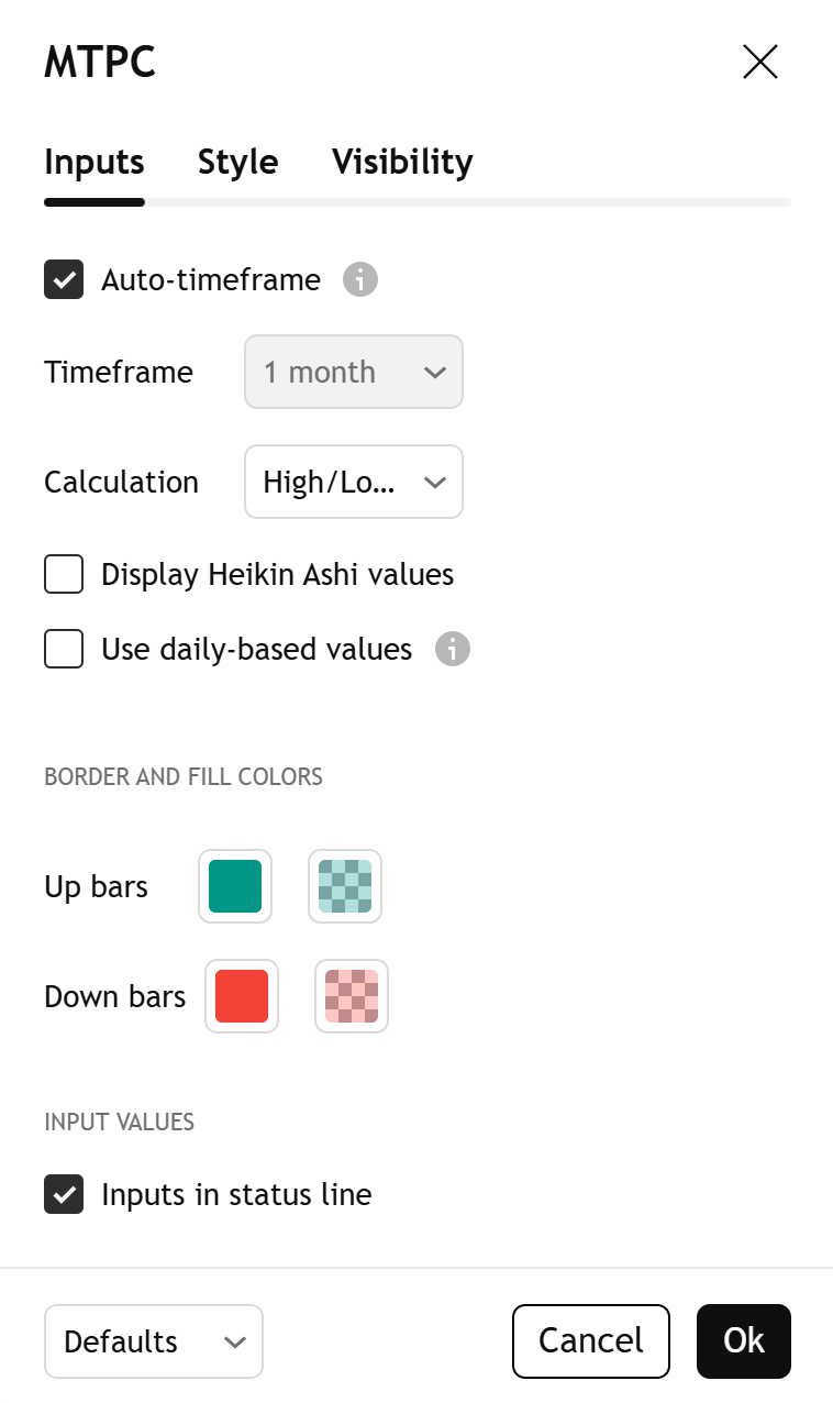 如果选中,指标会根据当前图表的时间周期自动选择更高的计算时间周期,其逻辑如上一节第一个表格所述。如果未选中,指标将使用“时间周期”输入指定的时间周期。