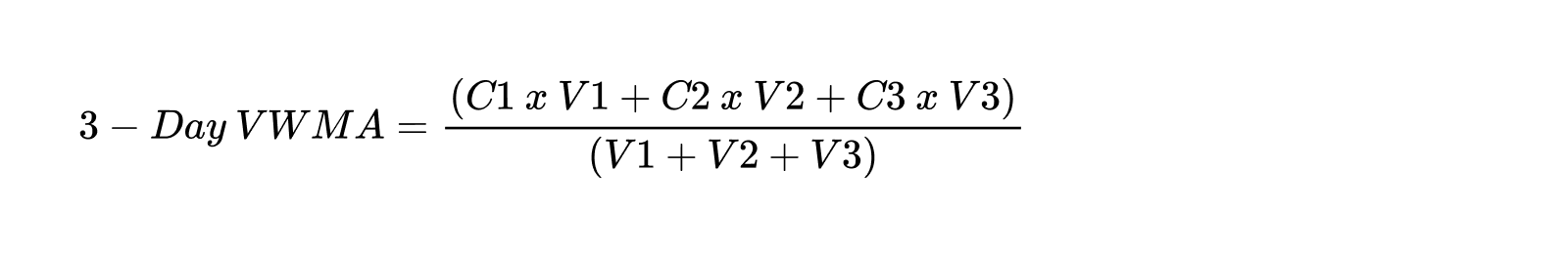简单移动平均线 (SMA) 是基于过去 n 个收盘价的平均值。它为等式中的每个收盘价赋予相同的权重。VWMA非常相似,只是它对每个收盘价赋予不同的权重并且取决于该时期的成交量。 请注意,如果 3 天VWMA(V3)的成交量较高,则其收盘价 (C3) 最终会对计算值产生更大影响。