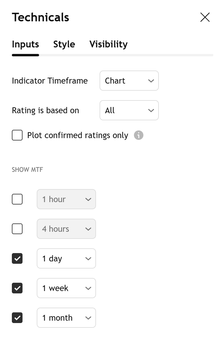 每个组成指标对每个选定时间周期的平均评级贡献一个值,分别为 -1(“卖出”)、0(“中性”)或 +1(“买入”)。最终的平均值在 -1 和 +1 之间波动,其中: