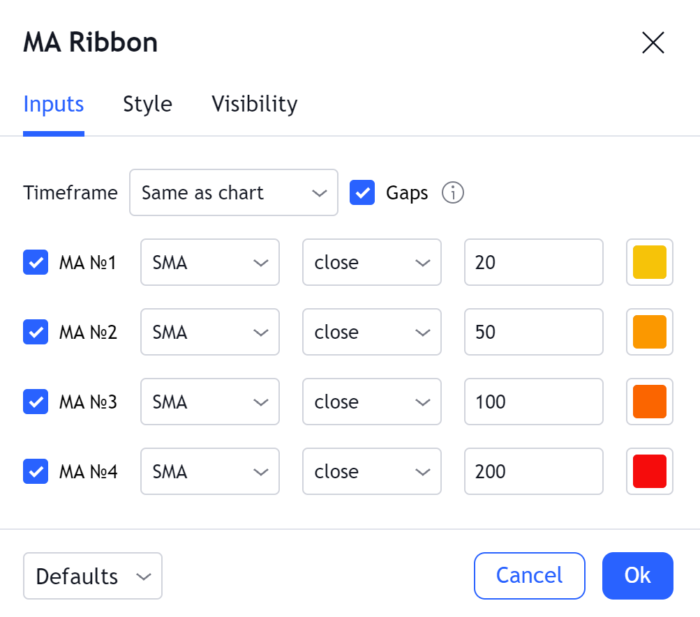 2. 带有 MA 类型的下拉列表允许选择每个图应使用的 MA。 选项包括 SMA(简单移动平均线)、EMA(指数移动平均线)、SMMA(平滑移动平均线)、WMA(加权移动平均线)和 VWMA(成交量加权移动平均线)。