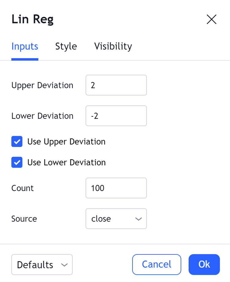 线性回归指标基于线性回归计算可视化图表特定部分的总体价格趋势。指标的中心线是线性回归计算本身,其上方或下方的线是从主要标准差中移除的 X 个标准差。 这是一个很好的工具,可用于确定价格何时异常远离其基线。