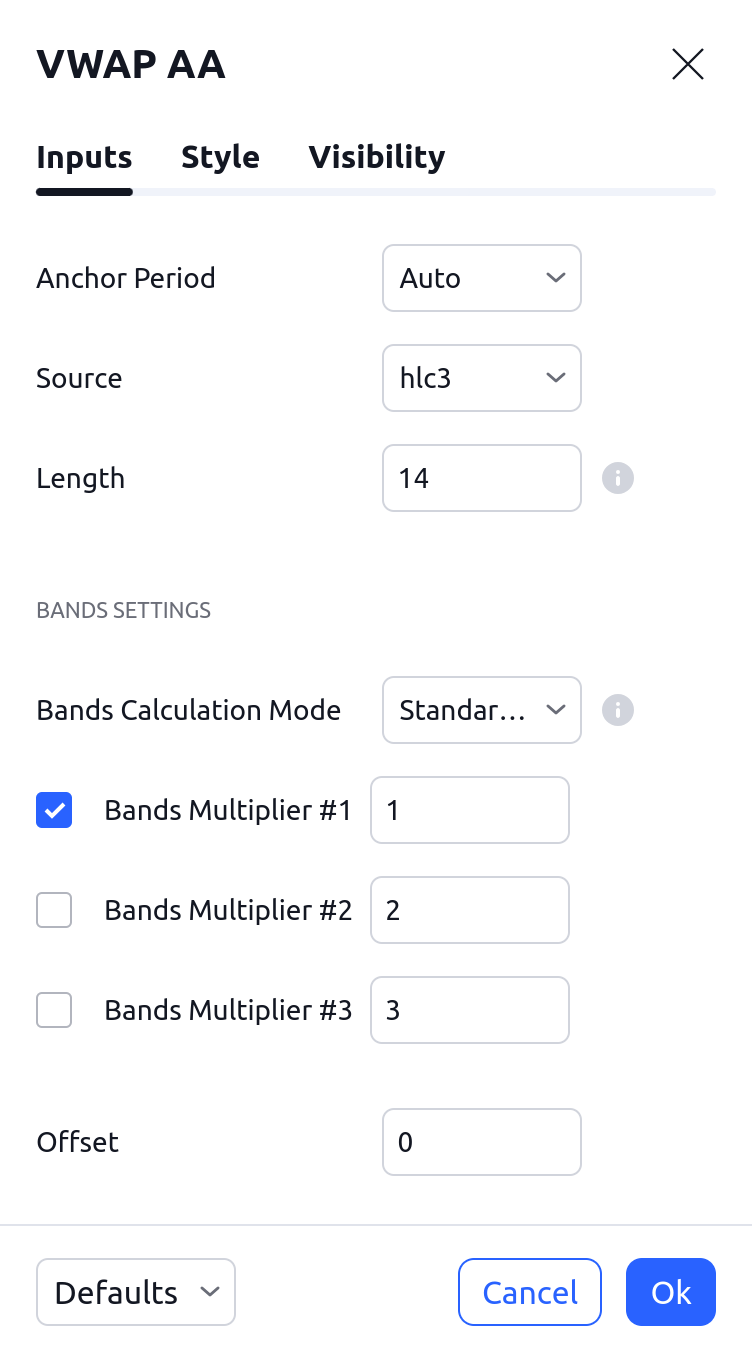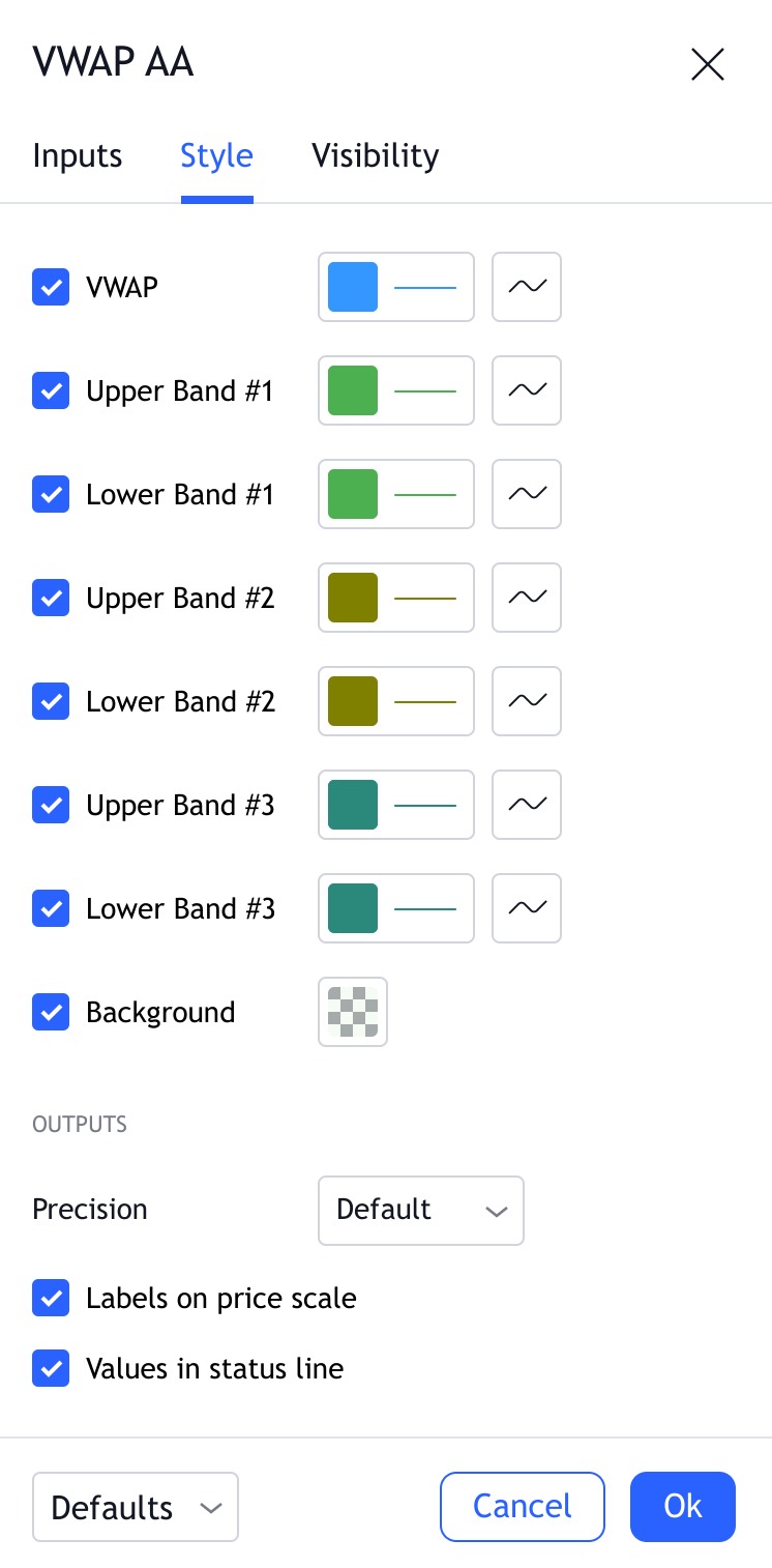 可以切换 VWAP 标准偏差带的可见性,并设置它们的颜色和线型。