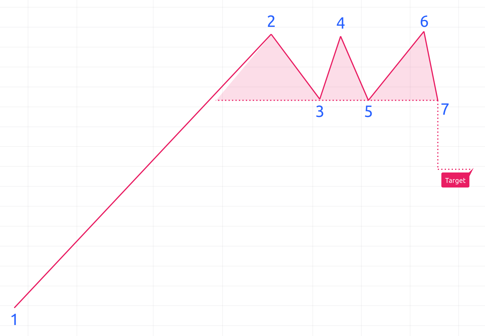 三顶是由三个连续的同一水平的高点(允许价格值略有不同)和它们之间的两个中间低点形成的反转形态。预计在价格达到第三个高点后跌破中间低点水平,然后将继续下跌大约高点和低点之间的差值。