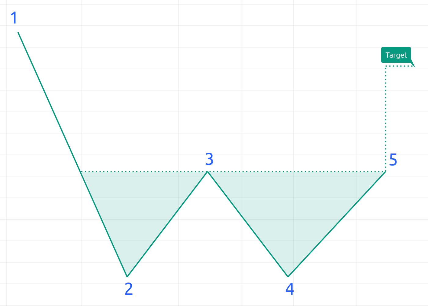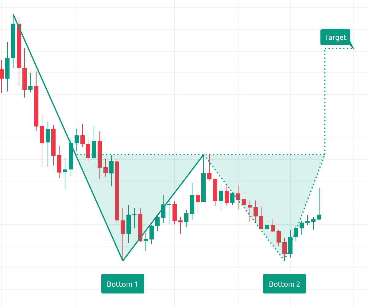 双底是由两个连续的处于同一水平的低点(允许值略有不同)和它们之间的中间高点形成的反转形态。预计在价格再次触及第一个低点水平然后转身并站上中间高点之后,预计价格进一步上涨将继续进一步达到低点和高点之间的差值。