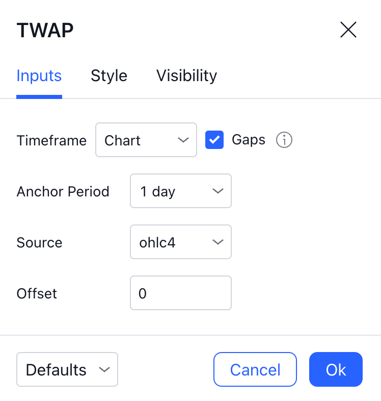 指标计算周期。 此设置指定锚点,即重置 TWAP 计算的频率。 为了使 TWAP 正常工作,每个 TWAP 周期都应在其中包含几个K线,例如将两者和时间周期都设置为“1D”没有用,因为指标将在每根K线上重置。