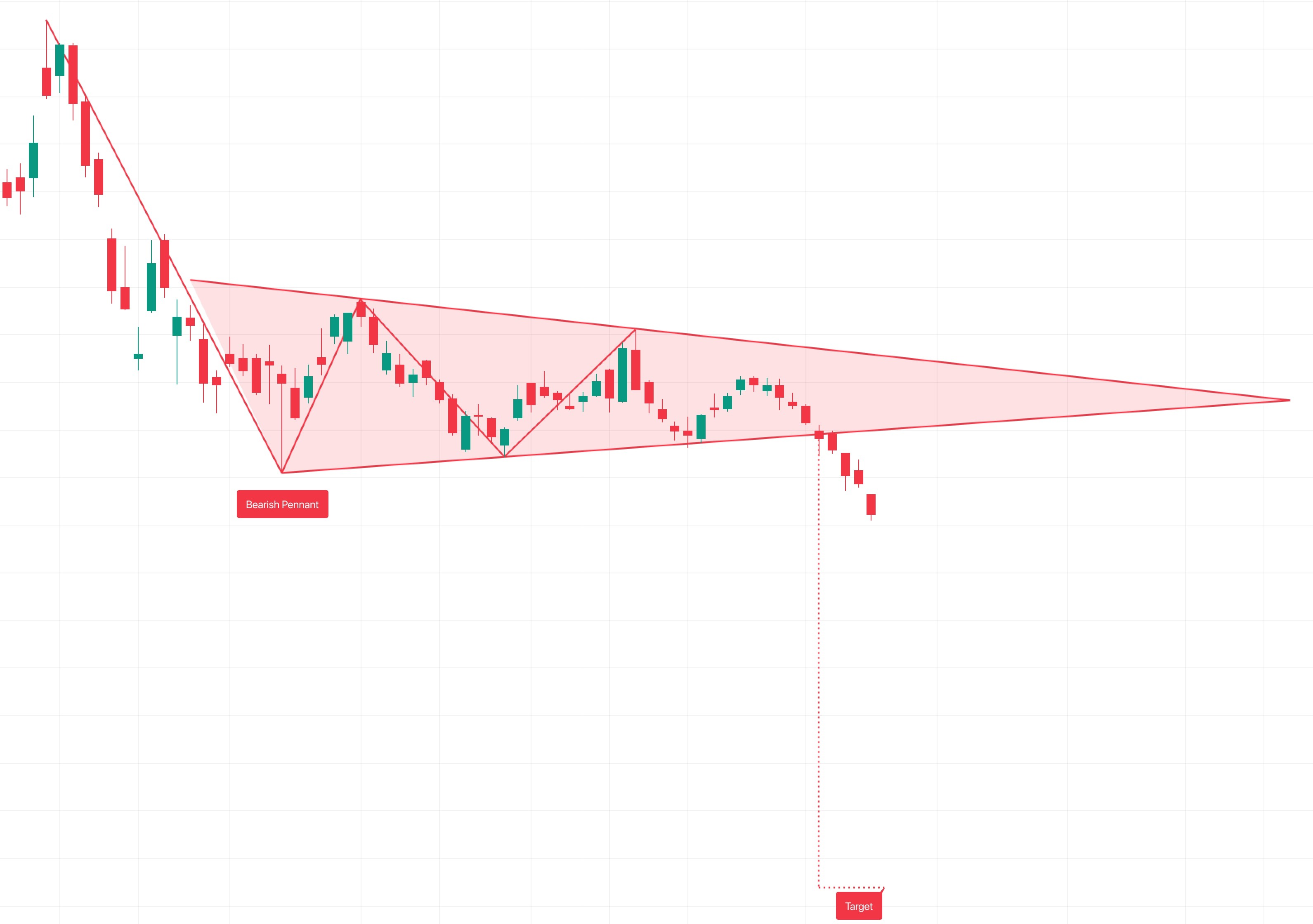 看跌三角旗是一种技术分析图,暗示在盘整区域之后主要趋势的延续。主趋势形成旗杆,盘整区为三角形 — 三角旗。预计价格下破三角旗下线后,其进一步下跌将持续至旗杆高度附近。