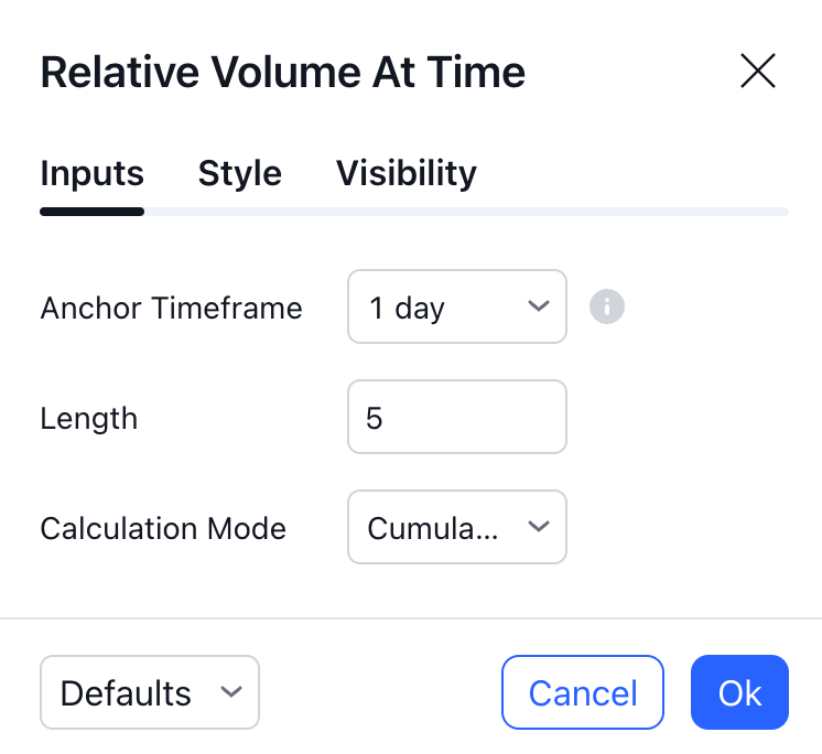 指定相对交易量计算中使用的周期大小,如上面的计算部分所述。 如果“锚定时间周期”值小于或等于图表的时间周期,则每个图表K线上的周期都会重置,这意味着指标将仅在计算中使用最后N根K线(其中N是“长度”值)。