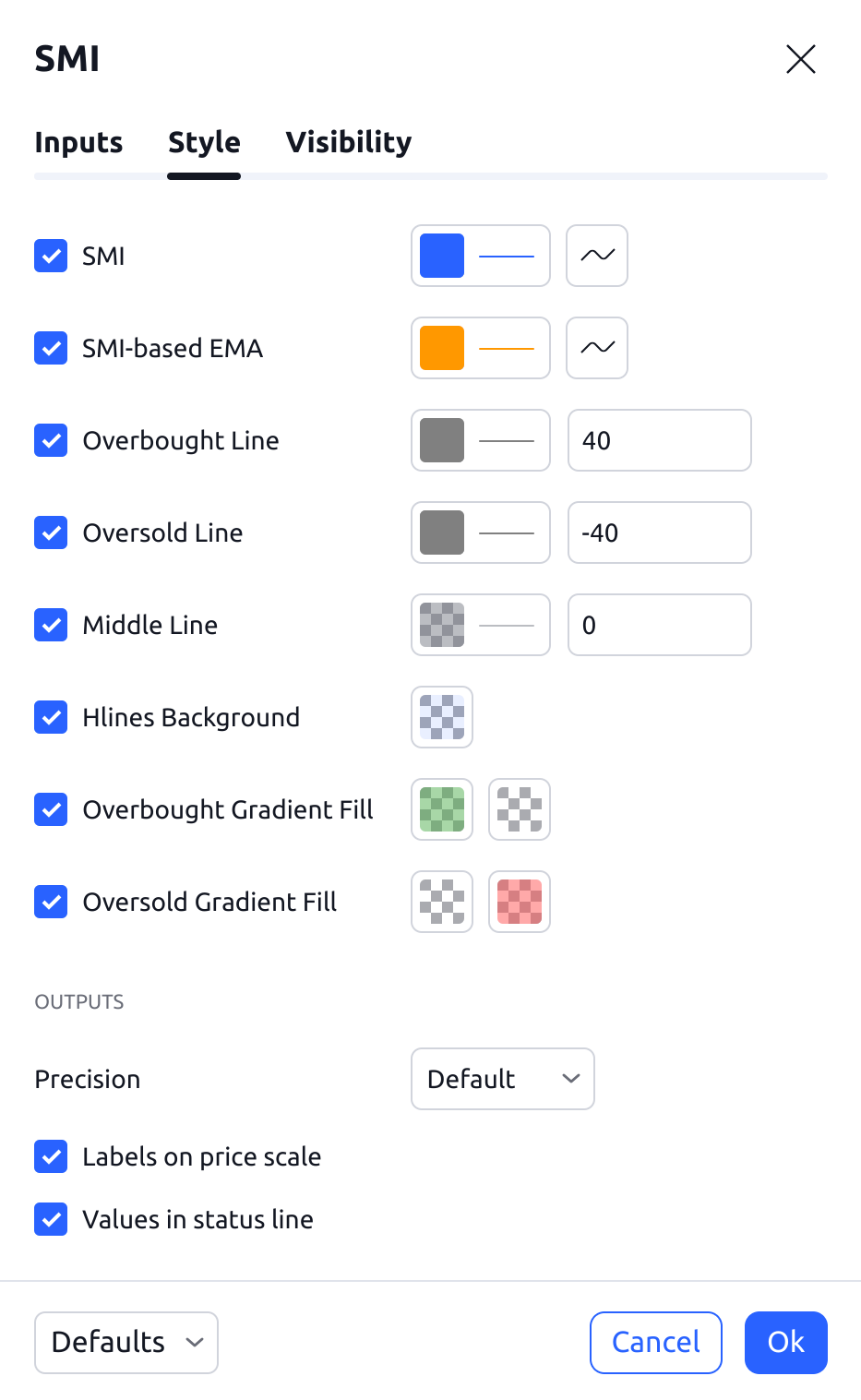 可以切换 SMI 的可见性,以及显示 SMI 实际当前价格的价格线的可见性。 还可以选择SMI的颜色、线条粗细和线条样式。