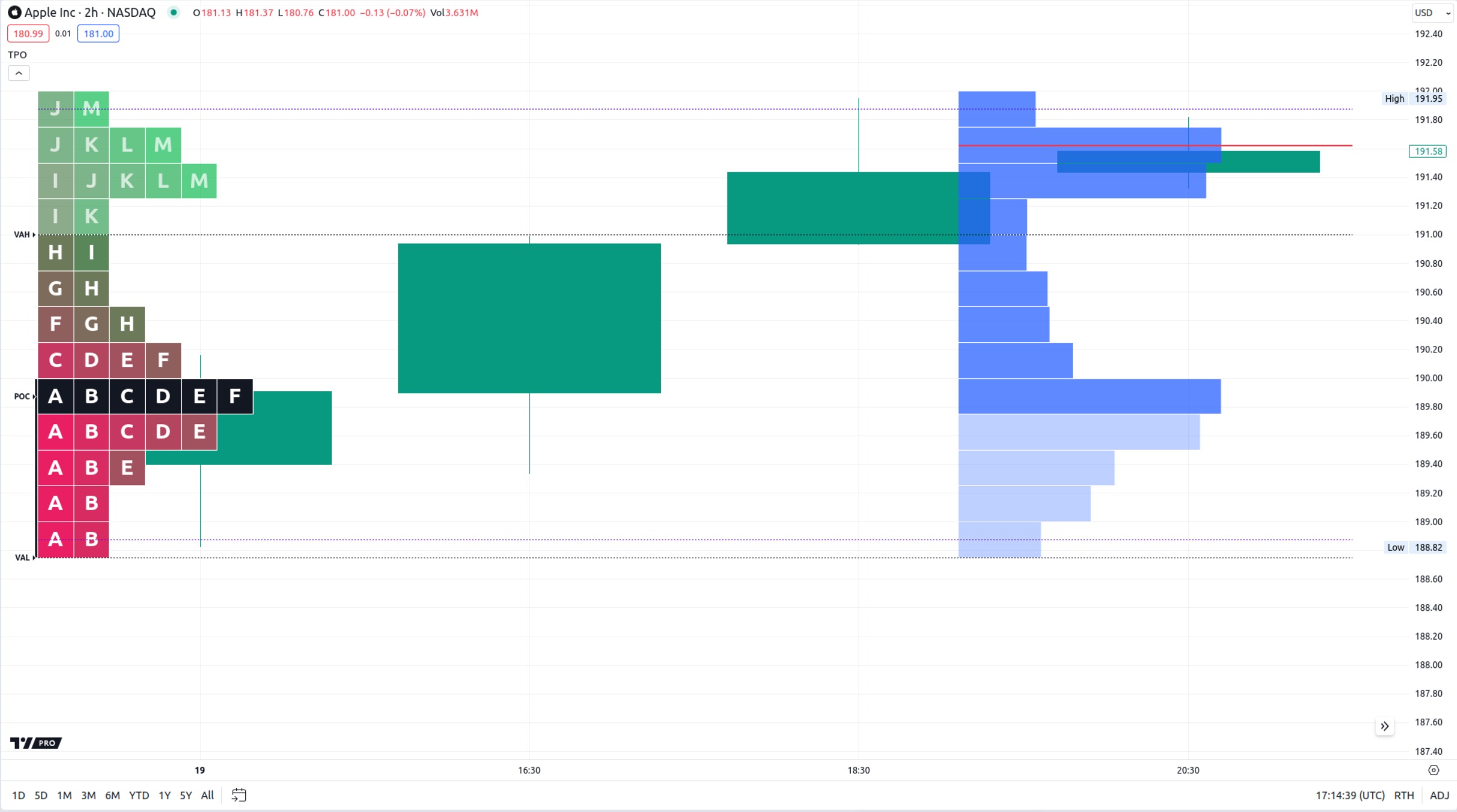 可选的成交量分布图使用“区块大小”时间范围内的数据进行计算。将成交量分布图与TPO分布图进行比较,有助于证实价格水平的重要性。