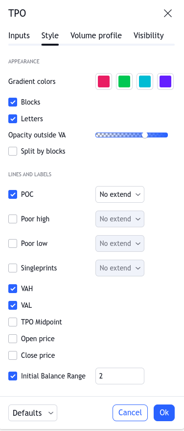 初始平衡范围是在分布图期间的第一个时间块期间访问的价格范围。市场在交易时段的开始部分可能会经历较高的交易活动。因此,交易者经常使用 IBR 来确定初始重要水平,这可以作为评估进一步价格走势时的参考点。TPO 指标将 IBR 显示为周期起点左侧的垂直线。用户可以从脚本“设置”的“样式”选项卡中启用 IBR 线及其计算中的时间块数。