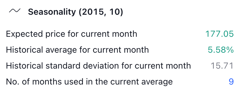 “当月历史平均值” – 特定月份开盘时的平均变化百分比。月份的预测框也会显示此值。