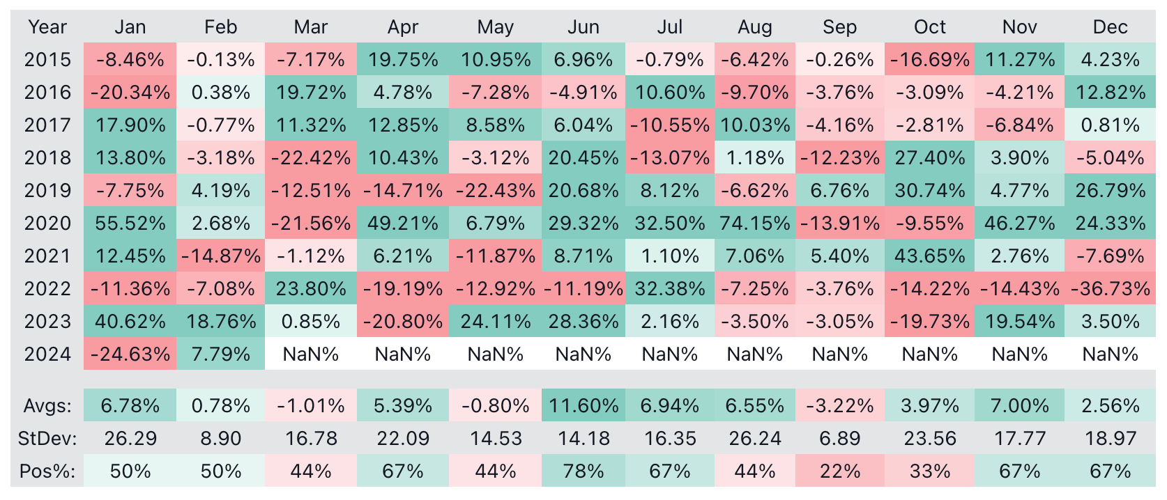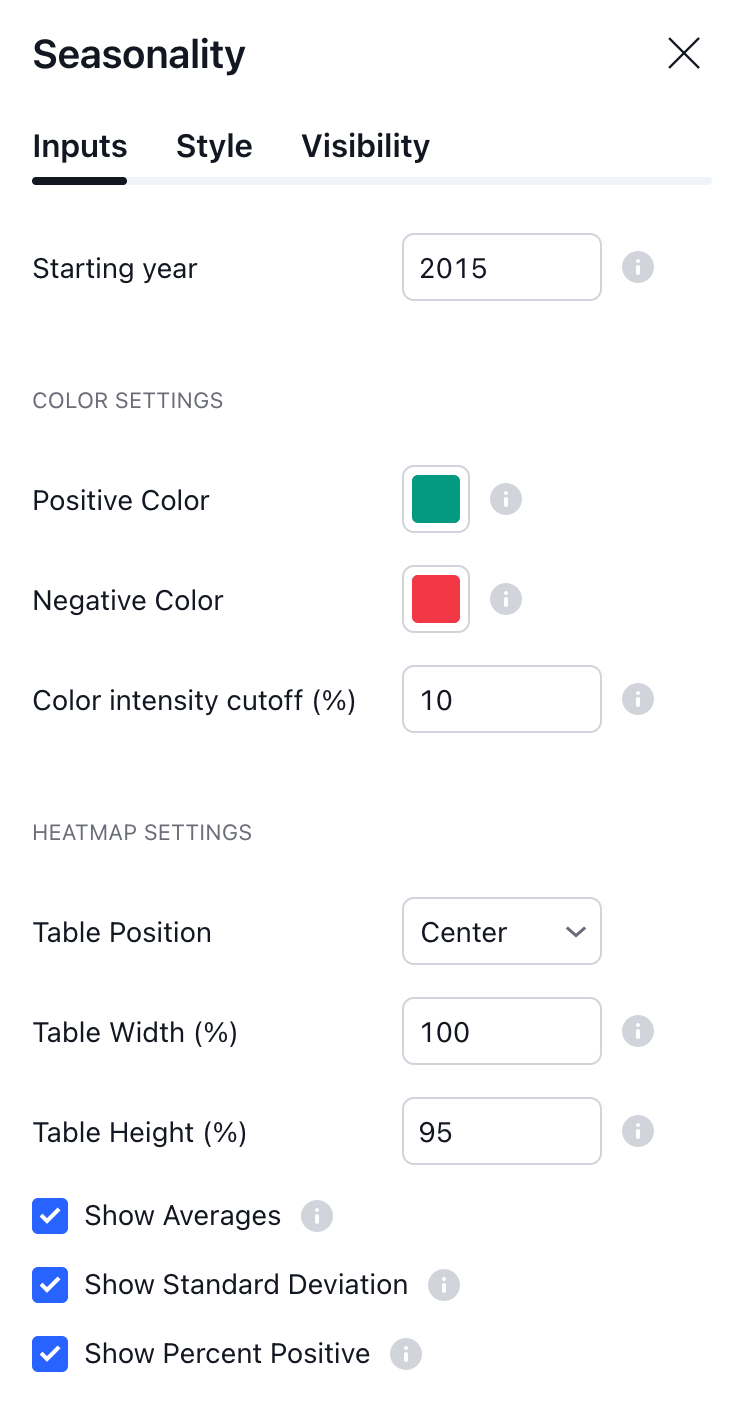切换“Pos%”行的可见性,该行显示每个月与前几年相比有多少实例发生了正变化。例如,如果同一个月在记录的九年中有六年发生了正变化,则“Pos%”比率将为 6 / 9 * 100 = 66.67%。