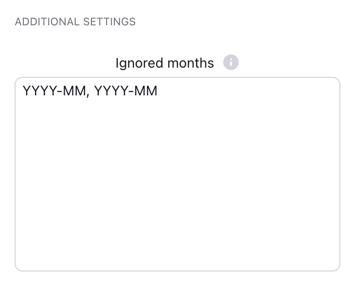 从季节性指标的计算中排除特定月份。要排除某个月份,请以“YYYY-MM”格式书写。用户可以用逗号和空格分隔多个月份来排除它们。例如,“2020-03, 2022-11”将排除2020年3月和2022年11月。