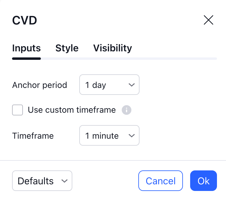 指定计算时段的大小。在每个新时段开始时,指标重置其交易量增量累积,并且当前K线的 CVD 蜡烛从 0 开始。在其它K线上,指标将每根K线的交易量增量添加到该期间的运行总计中,并且当前 CVD 蜡烛的开盘价与前一根蜡烛的收盘价一致。