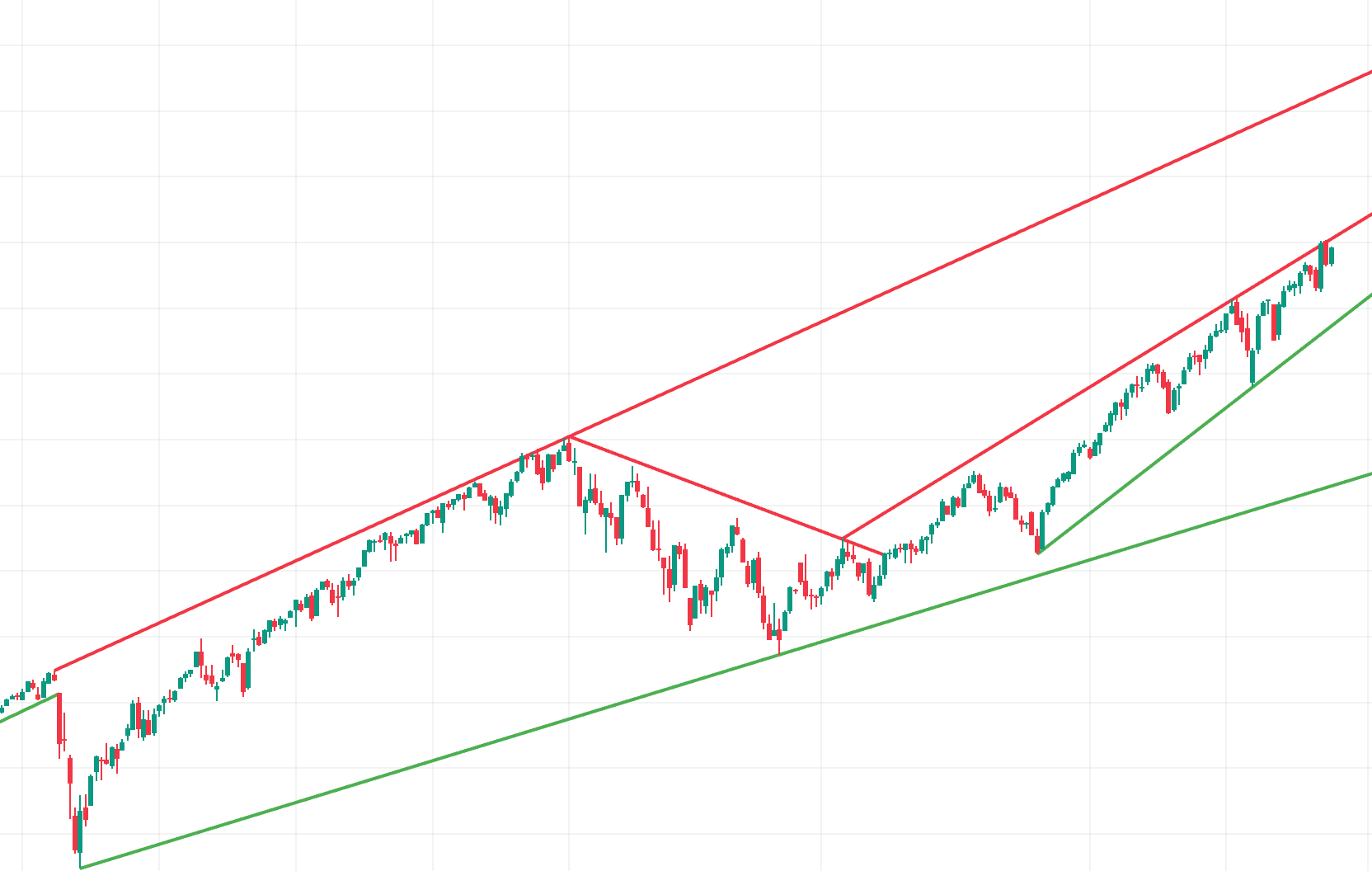 当图表上显示的所有线条都定义好后,指标将确定哪些线条应该延伸,哪些线条不应该延伸。这由以下规则决定:延伸长度不应超过底部长度的2倍以上。如果线条符合此规则,它将无限延伸至右侧或突破点,否则,图表将仅显示线条的底部。