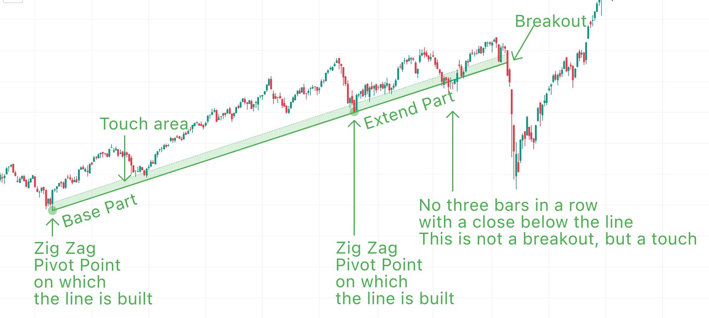 - 延伸部分。从第二个点到突破点或最后一个可用K线的线的部分。